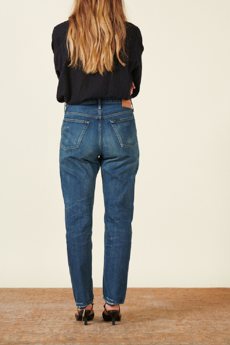 Jean Narrow Tapered Cut, de la marque Chimala, couleur bleu wash, fermeture par boutons, poches latérales, et poches arrières, coupe légèrement ample, et droite, petit effet d'usure sur l'avant et de délavage, également sur l'arrière de la pièce.