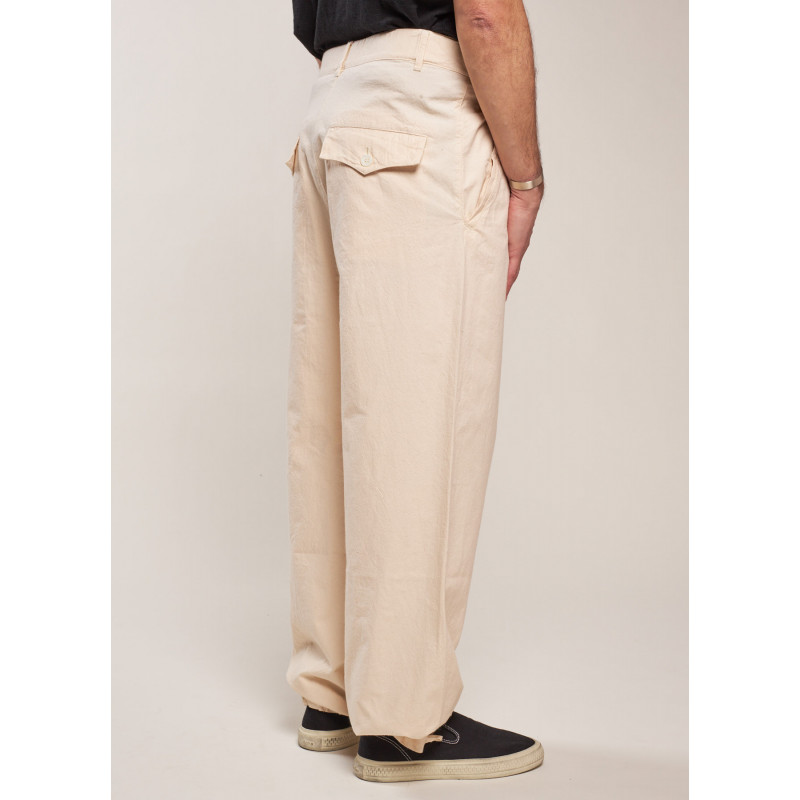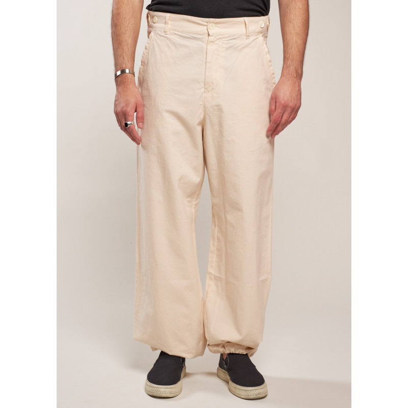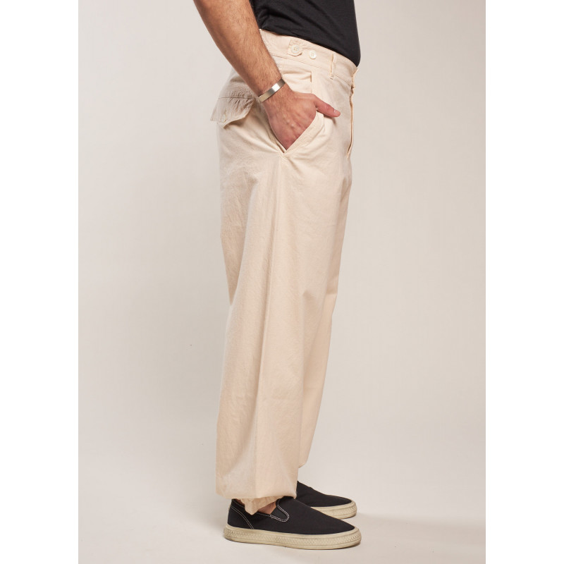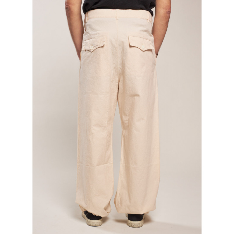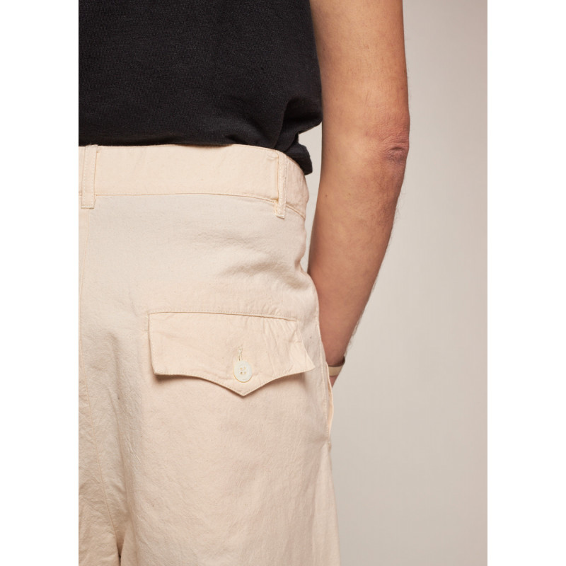 Pantalon fluide écru, poche latérale, fermeture par bouton et zip dissimulé, multiples passants, poches plaquées fermées par un bouton à l'arrière, ourlet avec lien de serrage.