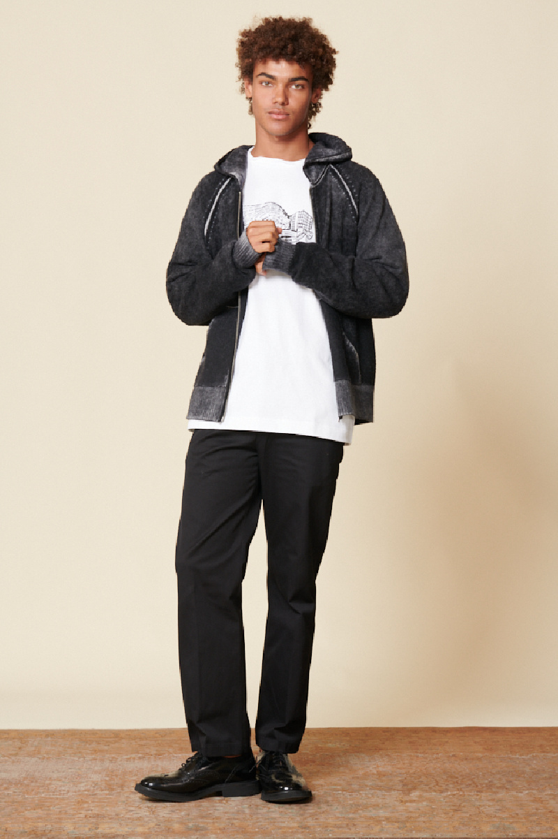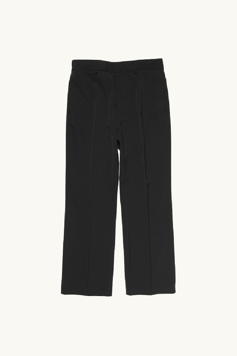 Le pantalon en coton noir de la marque Acne Studios, présente une coupe droite et une longueur régulière, avec des poches latérales et des poches arrière passepoilées, une fermeture par bouton et zip, une taille plutôt basse, des passants pour ceinture, et une toile légèrement épaisse.