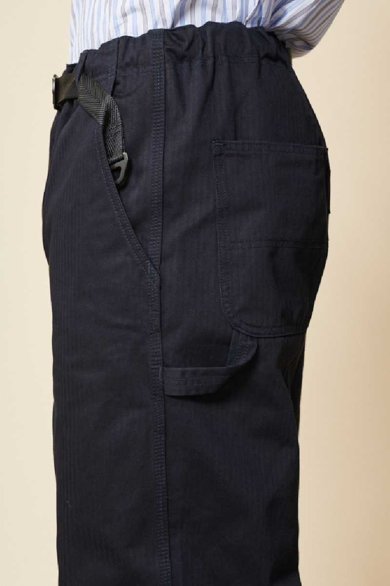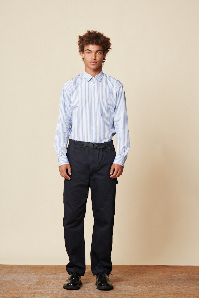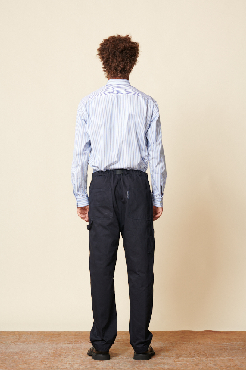 Le pantalon de la marque Comme des Garçons, en coloris bleu marine est confectionné en coton, avec une coupe loose et des jambes fuselées, une taille élastique, avec une ceinture en nylon, une fermeture par bouton et zip, deux poches avant et deux poches plaquées à l'arrière, ainsi qu'une poche supplémentaire sur le côté droit de la cuisse.