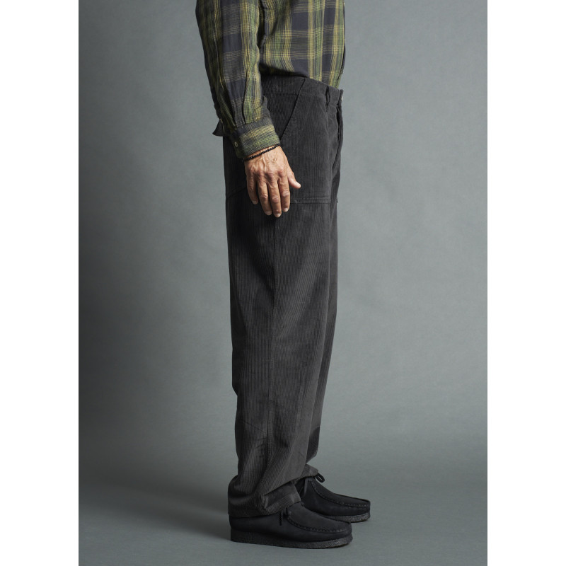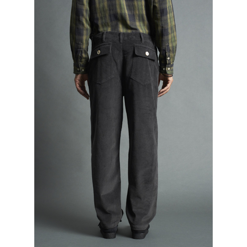 Pantalon Bsbee, cargo en velours de coton anthracite, coupe décontractée, deux poches profondes et une poche plaquée boutonnée à l'arrière, passants pour ceinture, fermeture à boutons sous patte, ourlet brut effiloché.