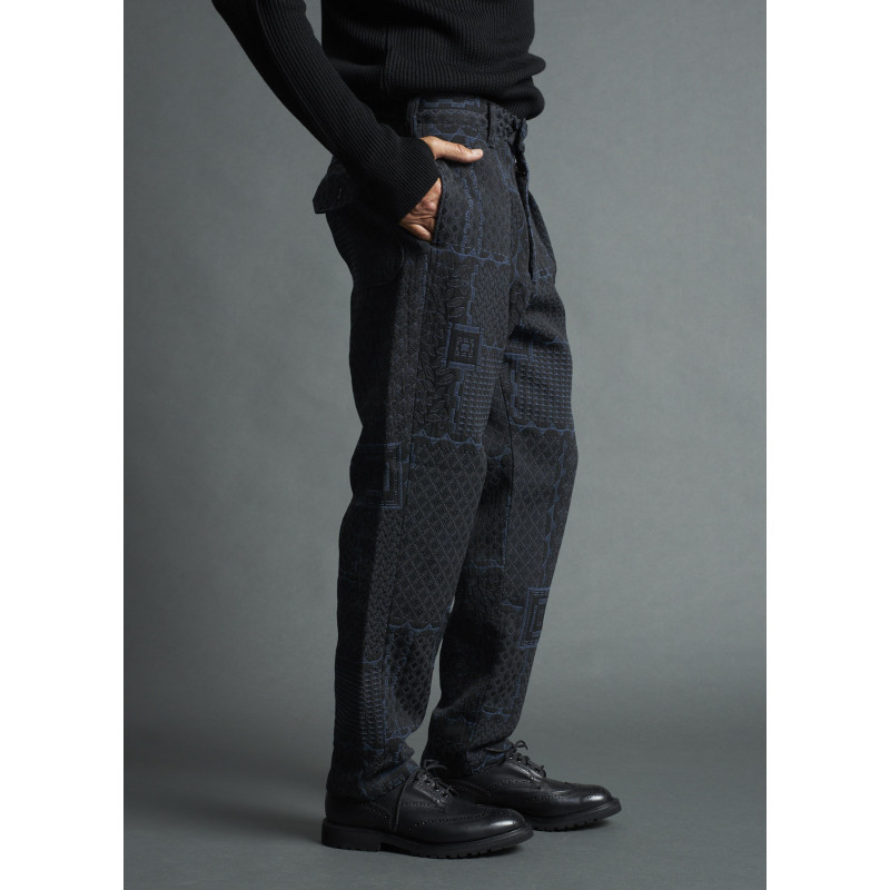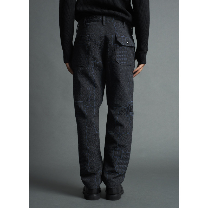 Pantalon Engineered Garments à multiples imprimés, relaxed fit, poches latérales, poches passepoilées fermées par boutons à l'arrière, multiples passants, fermeture par bouton et cordon de serrage, ourlet droit.