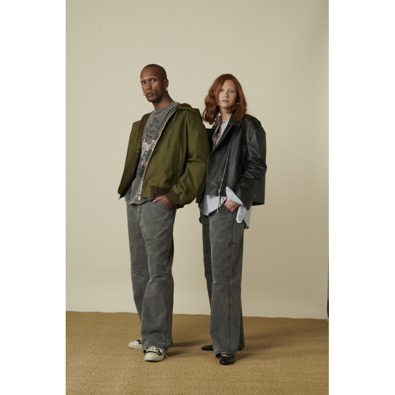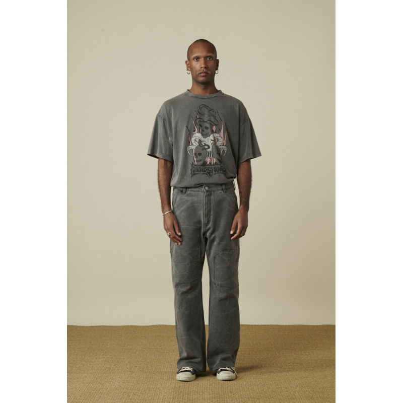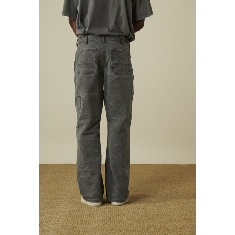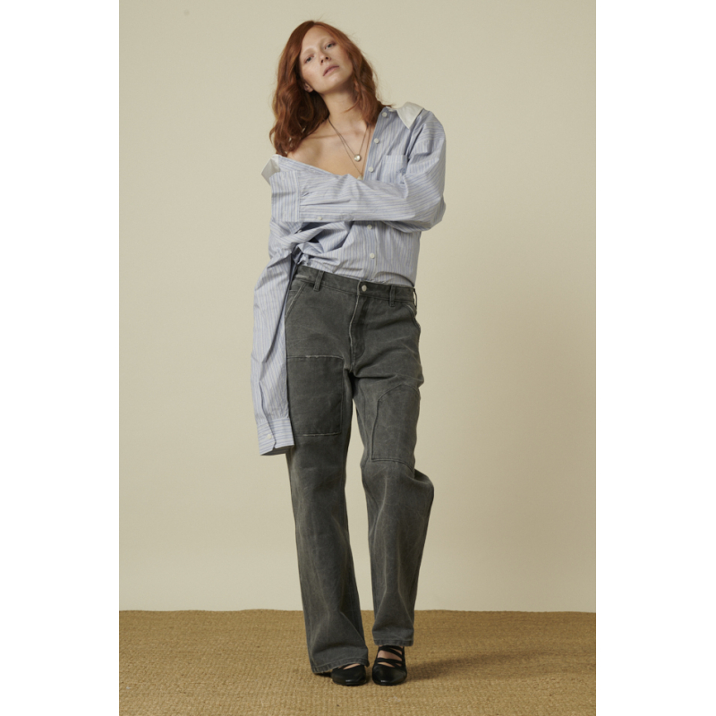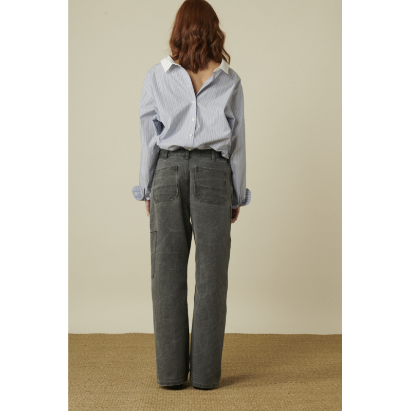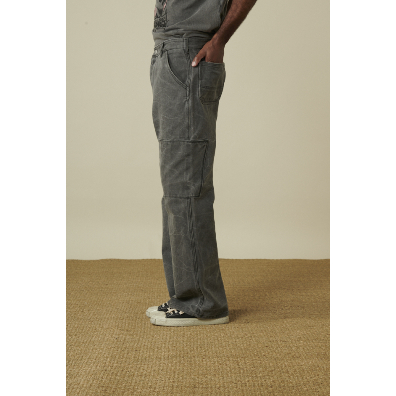 Pantalon Acne Studios carbon coupe droite , coton tissé épais, teint par pigmentation, patch cargo face , poches avant en biais, poches arrière plaquées surpiquées, taille basse.