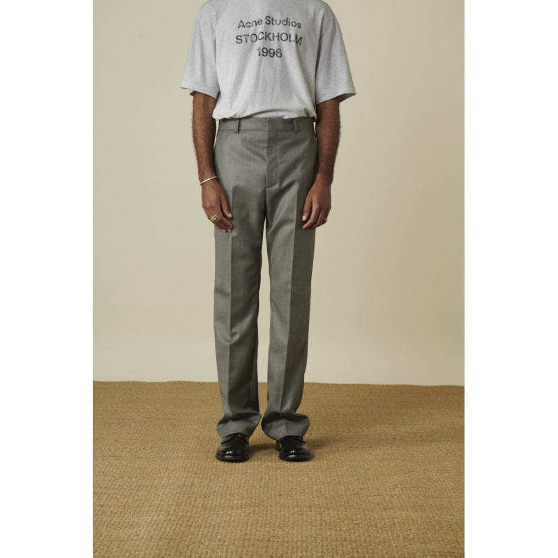 Pantalon de tailleur gris, de la marque Acne Studios, coupe droite et taille mi-haute, poches latérales et aux dos avec deux boutons de chaque côté pour la fermeture, système d'agrafe pour fermeture centrale, plus boutons pour serrer davantage le pantalon.
