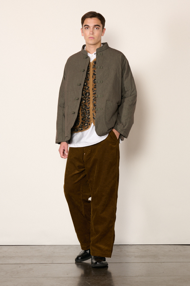 Il offre une silhouette ample avec une jambe large, une construction à 5 poches, une ceinture avec patte d’ajustement à boutons pression et une ouverture par bouton pression et zip.