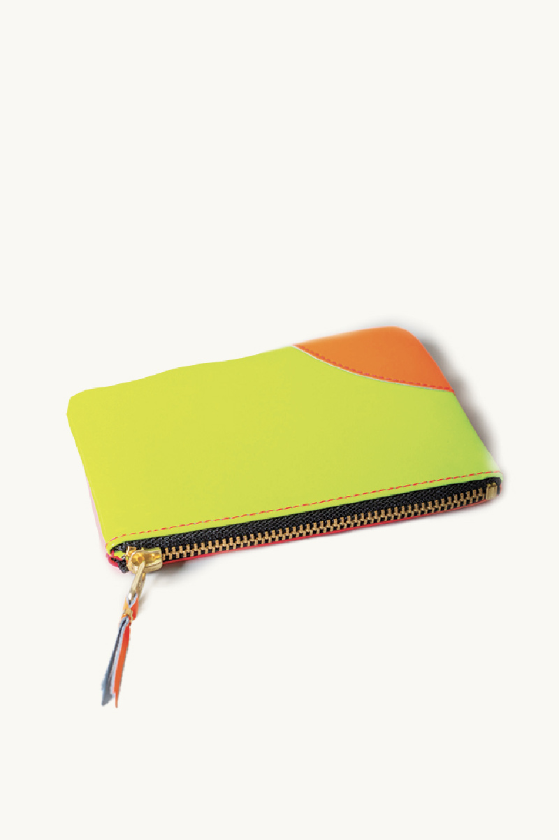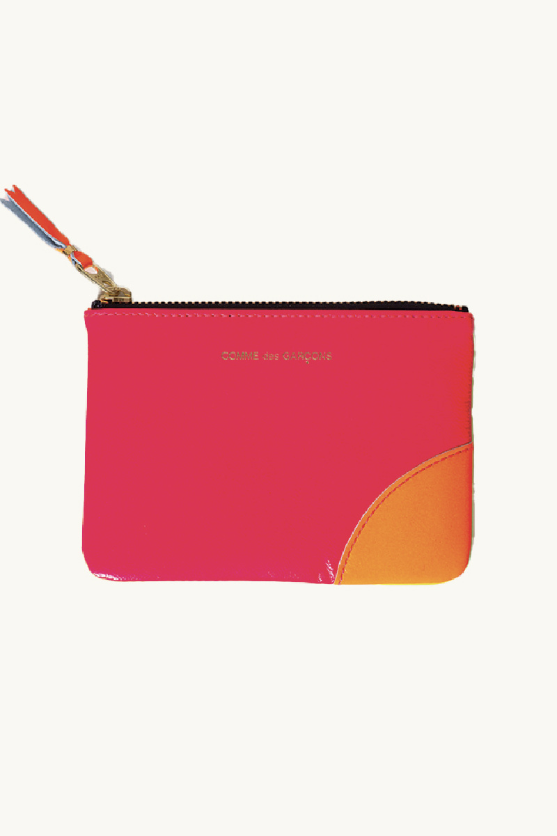 Grand porte-monnaie de la marque Comme Des Garçons, rose et jaune, logo dorée à l'avant, fermeture zipée, doublure en cuir noir drainée.