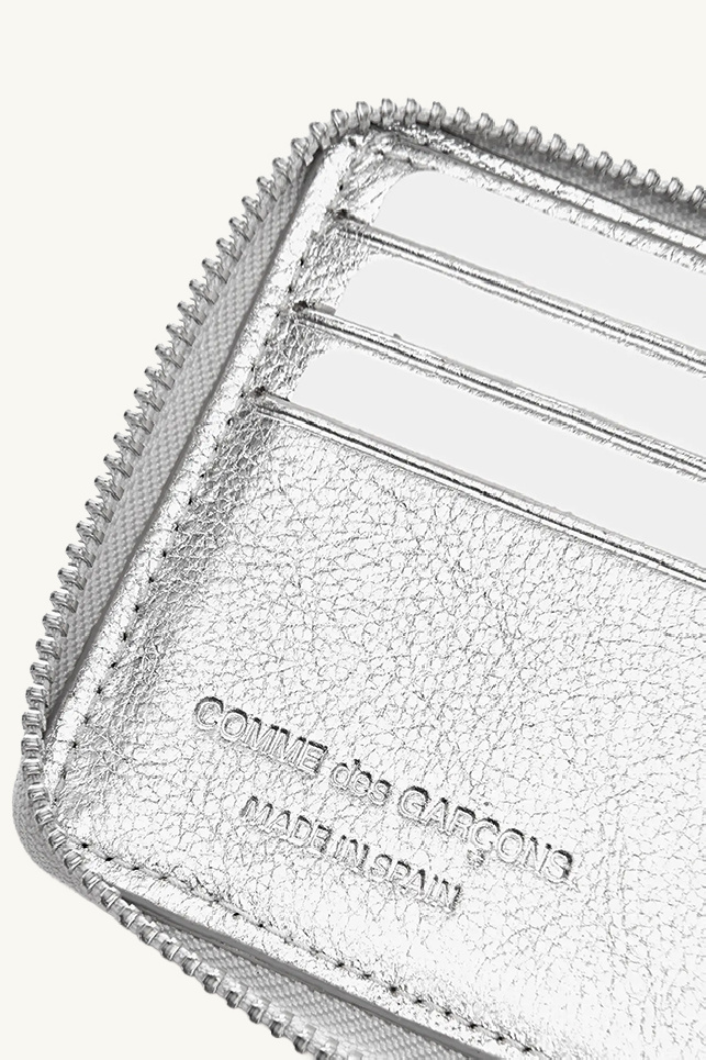 Porte-carte argenté de la marque Comme Des Garçons, en cuir de vachette effet craquelé.