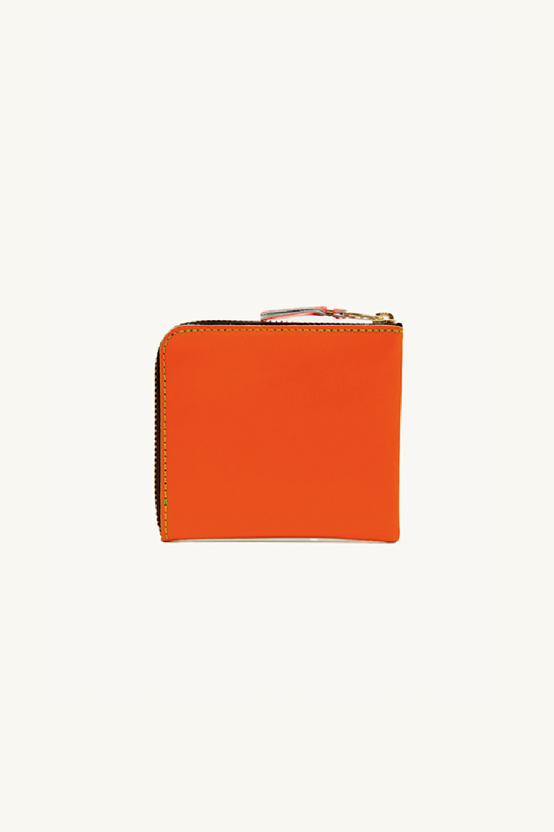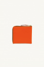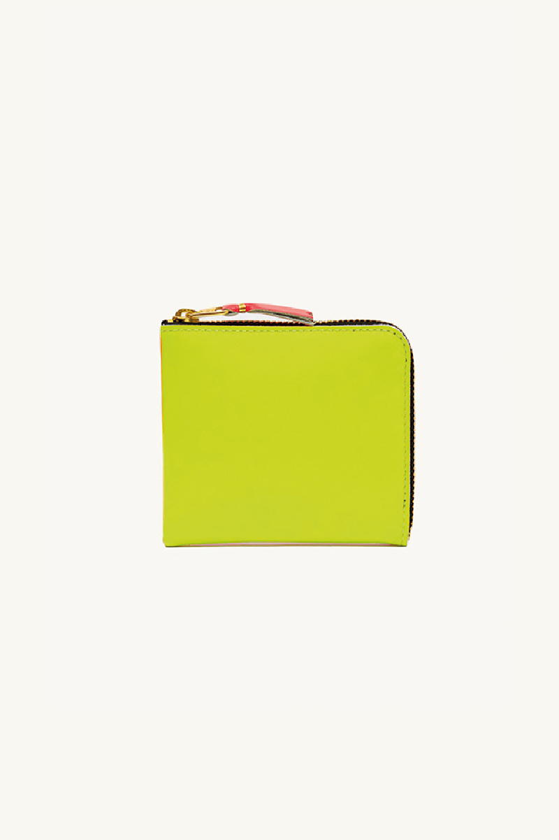 Petit portefeuille de la marque Comme des Garçons, en cuir de chèvre, de couleurs fluo : jaune et orange à l'extérieur, rose à l'intérieur.