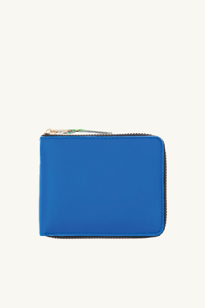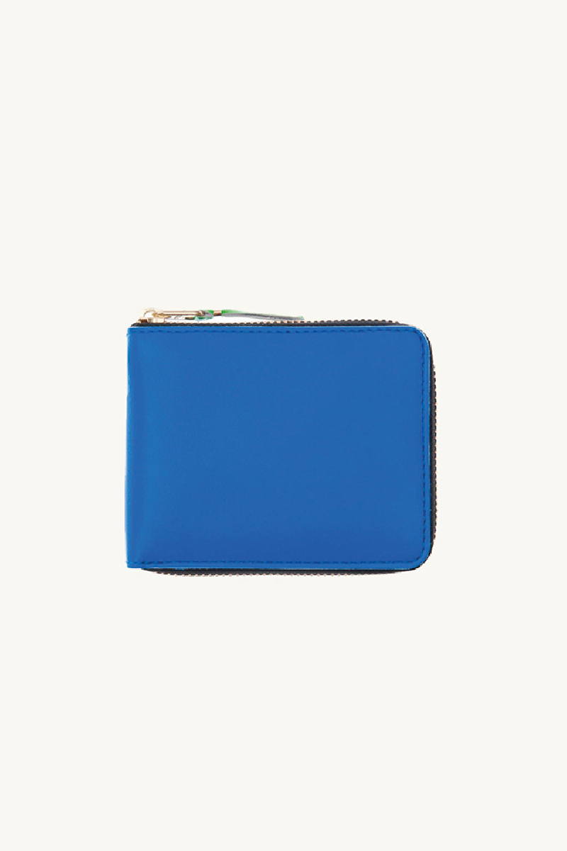 Porte-cartes Comme des Garçons, en cuir de vache, couleurs fluo : extérieur bleu, intérieur rose et vert, fermeture zippée, compartiment porte-cartes quatre encoches et rangement pièces avec fermeture boutonnée.