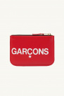 Petite pochette de la marque Comme des Garçons en cuir de vache lisse rouge avec logo blanc.