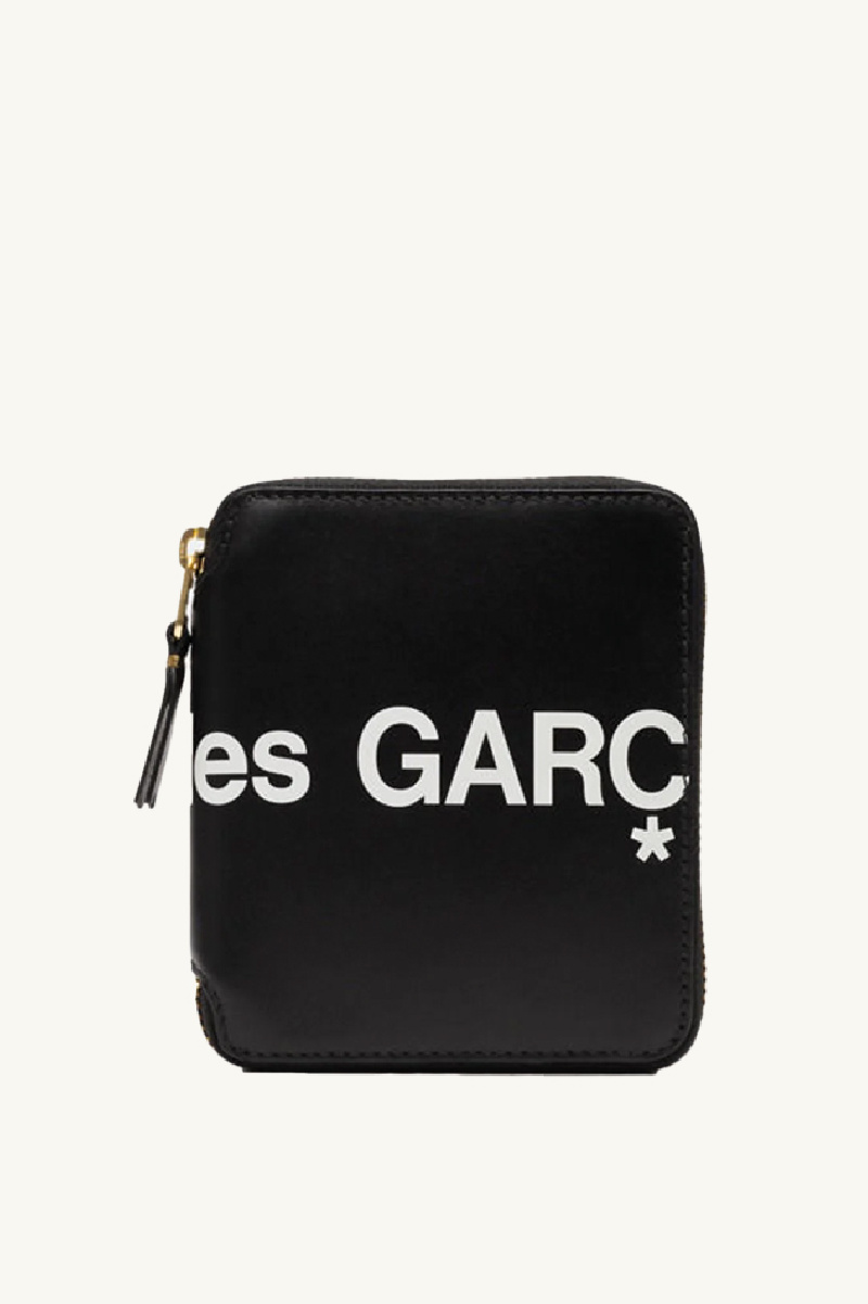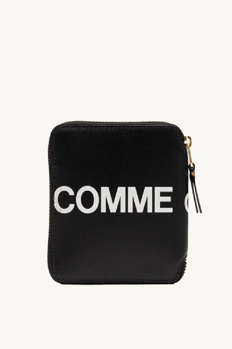Grand porte monnaie Comme des Garçons, en cuir de vache, couleur noir, écriture blanche, fermeture zippée, compartiment porte-cartes quatre encoches et rangement pièces avec fermeture boutonnée.