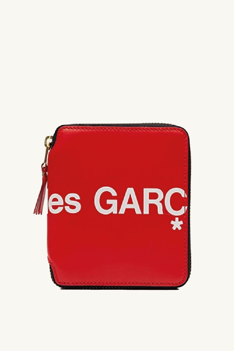 Grand porte-cartes Comme des Garçons, en cuir de vache, couleur rouge, écriture blanche, fermeture zippée, compartiment porte-cartes quatre encoches et rangement pièces avec fermeture boutonnée.