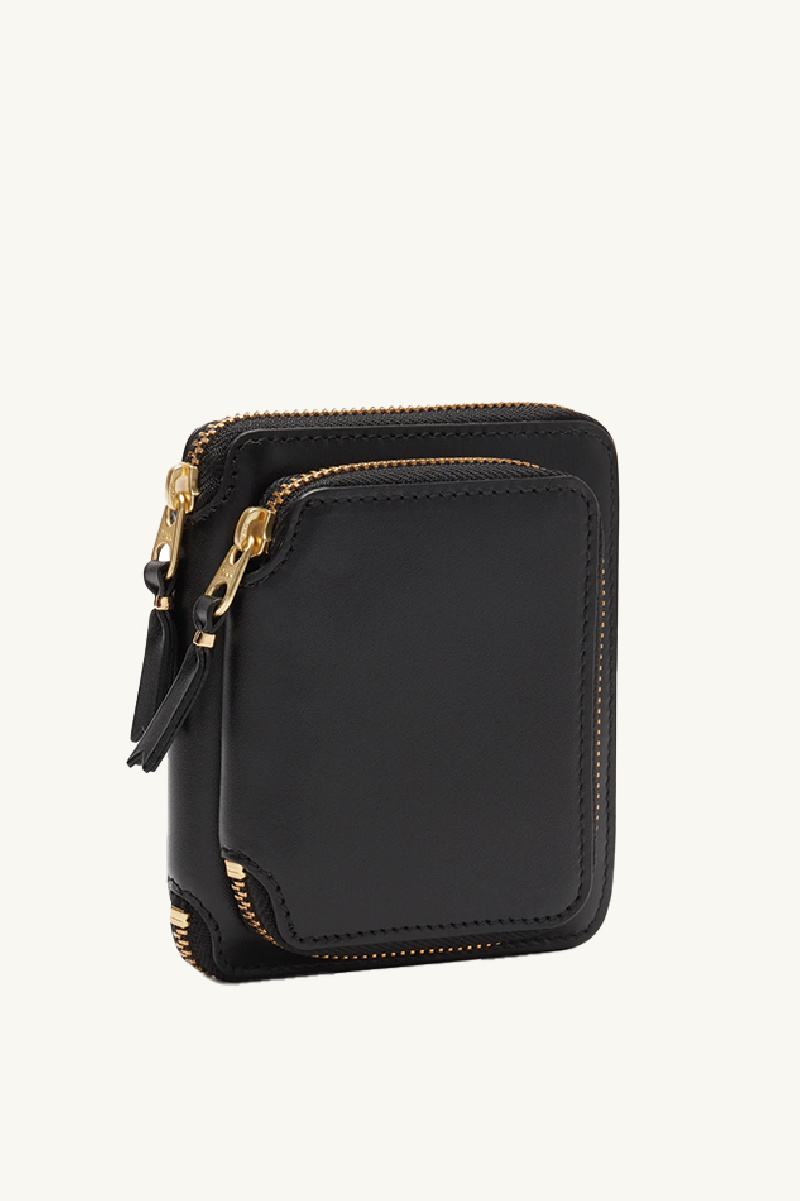 Grand porte-monnaie de la marque Comme Des Garçons, noir, quatre fentes pour carte sur la plus grande poche, compartiment pour la monnaie et poche pour les billets, deux fermetures zippées.