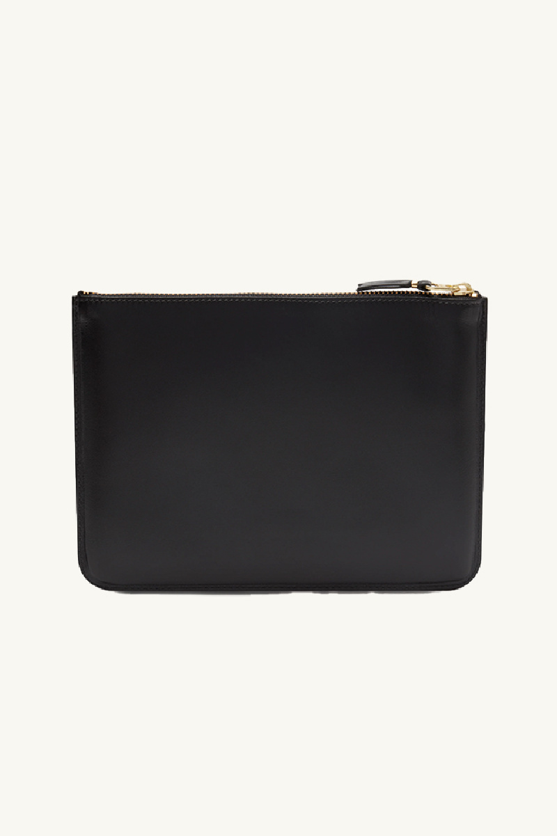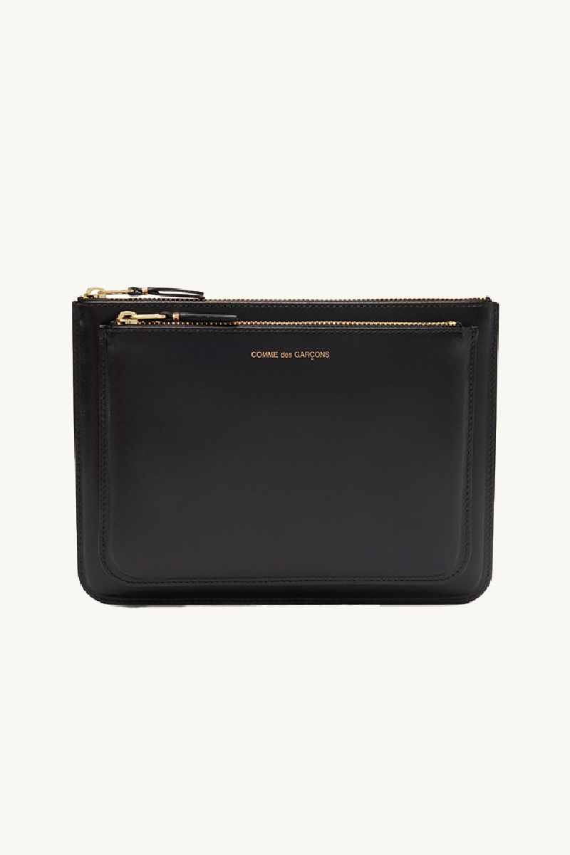 Grand porte-monnaie/pochette de la marque Comme Des Garçons, noir, avec deux compartiments, fermeture zippée pour chaque compartiment, logo gaufre en feuille d'or.