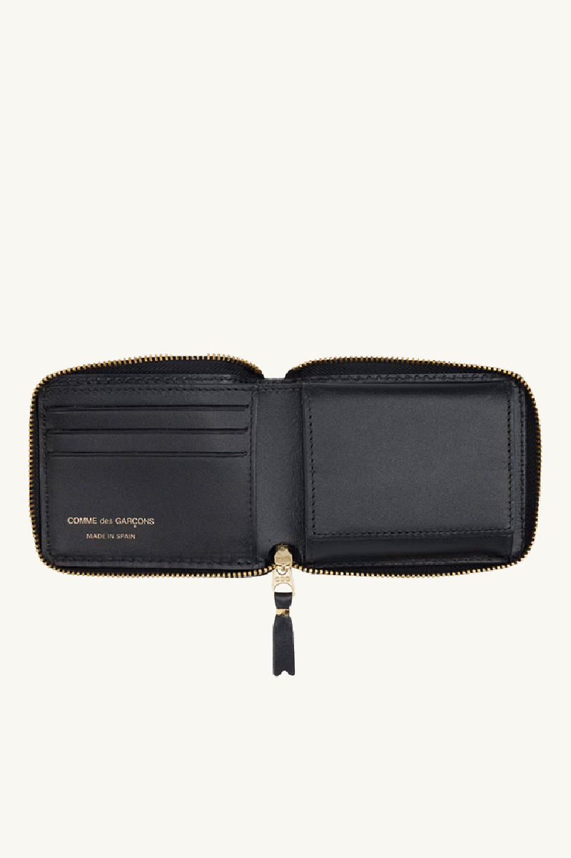Fermeture par zip, intérieur en cuir avec inscription couleur or, compartiment pour billets, fentes pour cartes, pochette à monnaie avec fermeture par pression.