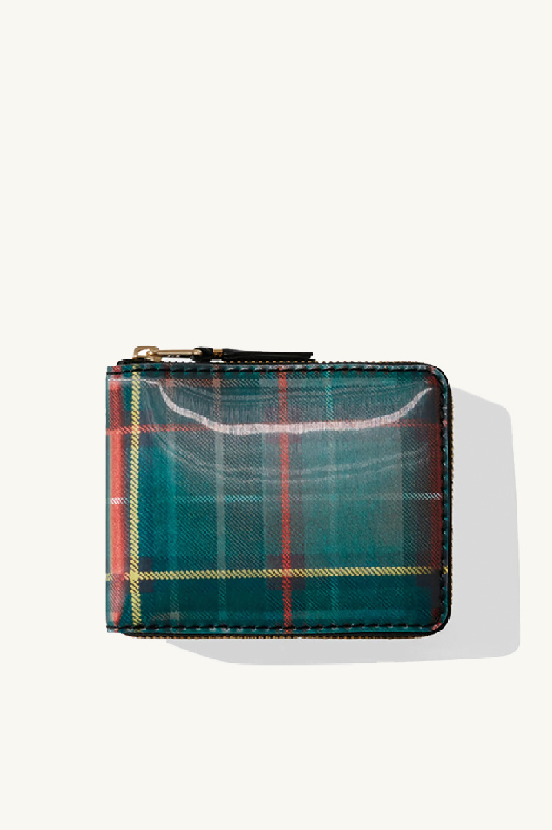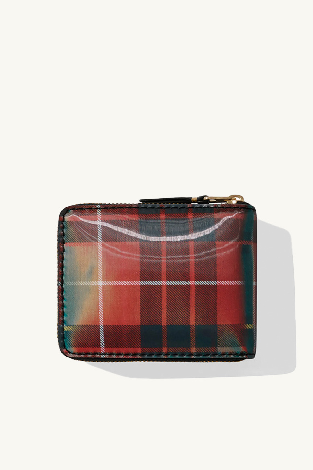 Porte-monnaie de la marque Comme Des Garçons, rouge et vert, impression lenticulaire avec motif tartan écossais.