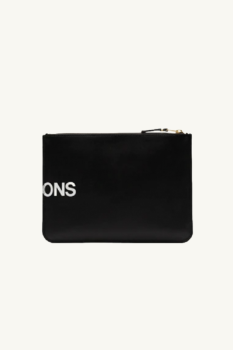 Pochette de la marque Comme des Garçons confectionnée en cuir de veau noir avec logo blanc.
