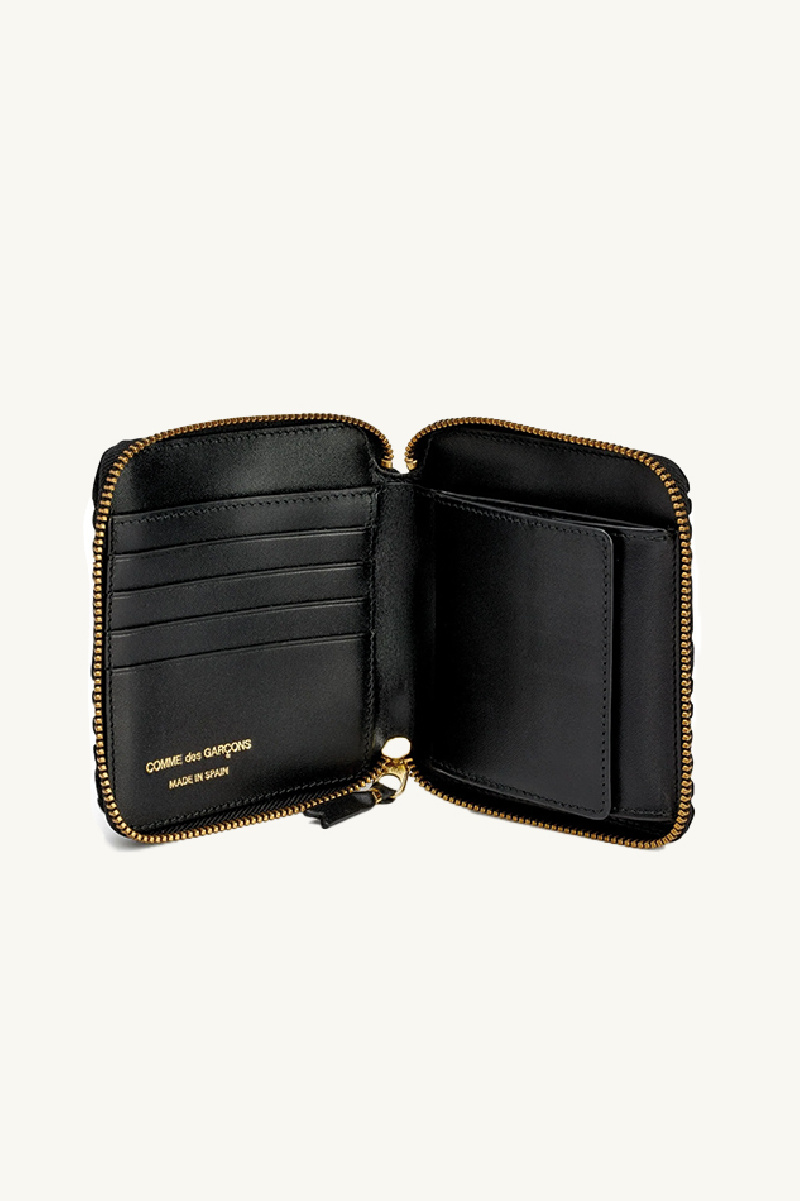 Fermeture par zip, intérieur en cuir noir avec griffe dorée, compartiment pour billets, fentes pour cartes, pochette à monnaie avec fermeture par pression.
