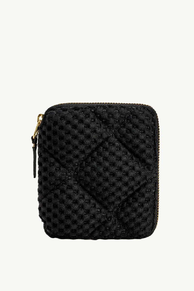 Grand porte-monnaie Comme des Garçons noir, matelassé en nid d'abeille, doublé en cuir de vache.