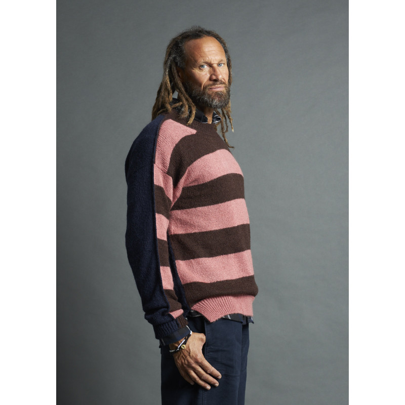 Pull President's en mohair rayé rose et bordeaux, uni bleu marine sur l'arrière, bords-côtes sur l'ourlet et le col.