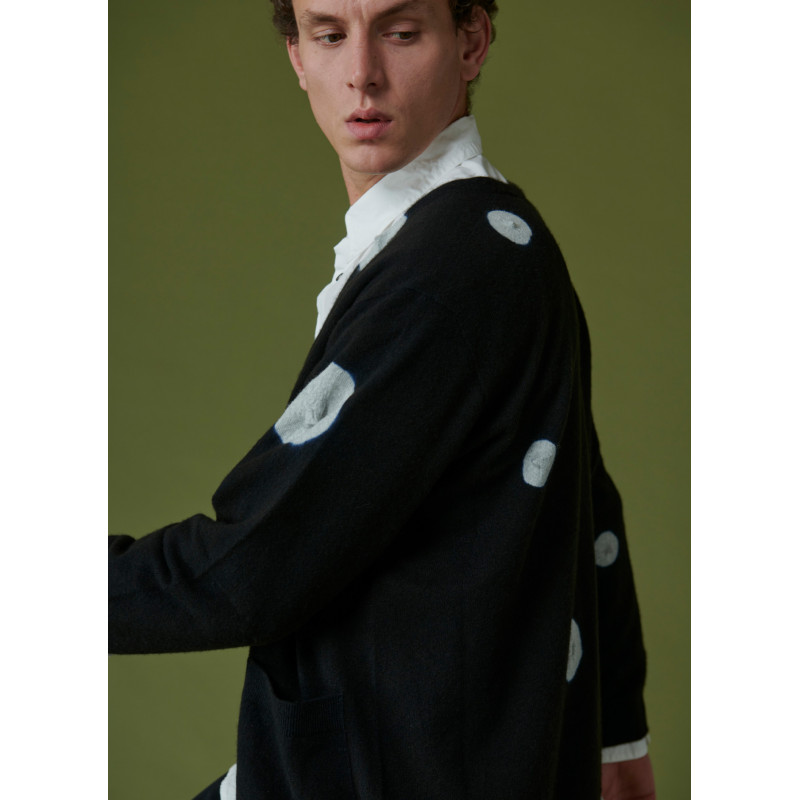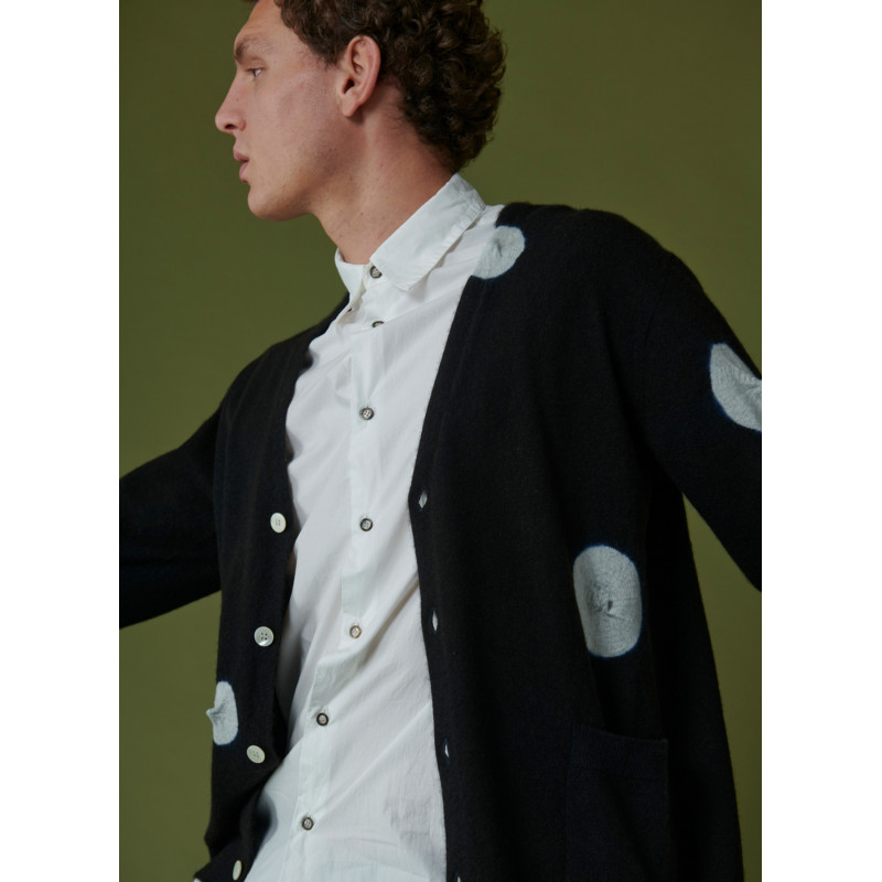 Cardigan Shibori de la marque Suzusan, col V, fermeture par boutons blanc, empiècements rond gris sur l'intégralité du gilet.