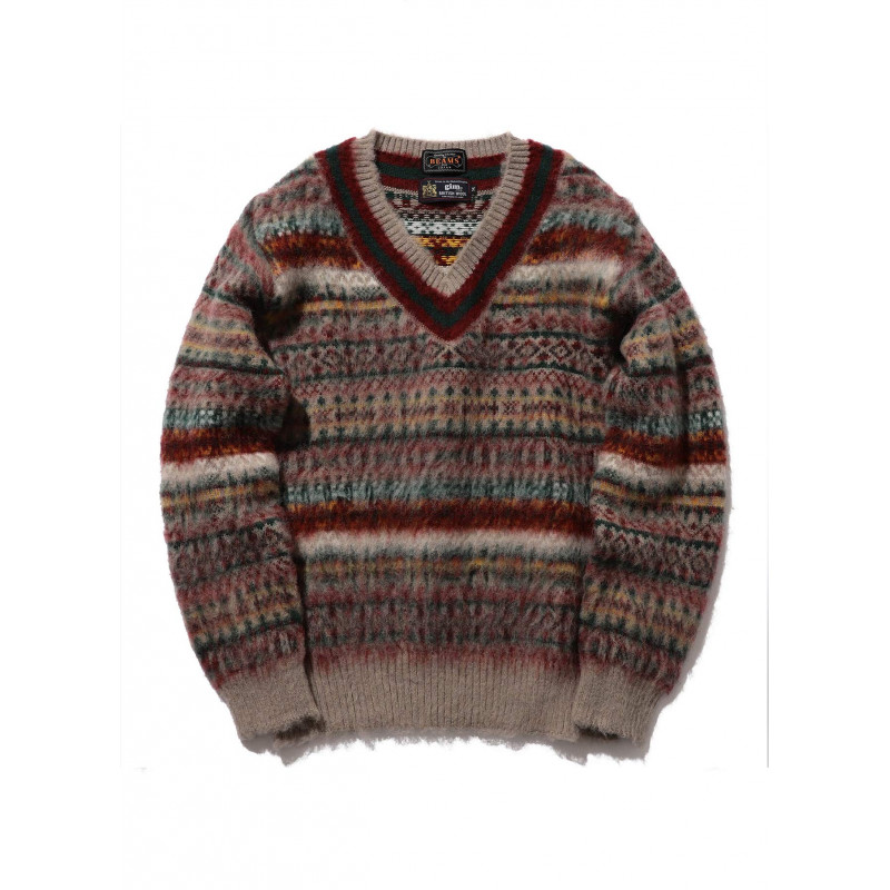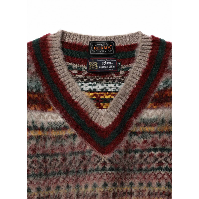 Pull col V Cricket Fair isle V-Neck Laine Anglaise Bim de la marque Beams Plus. Imprimé Jacquard beige/multicolore, coupe droite et ample.