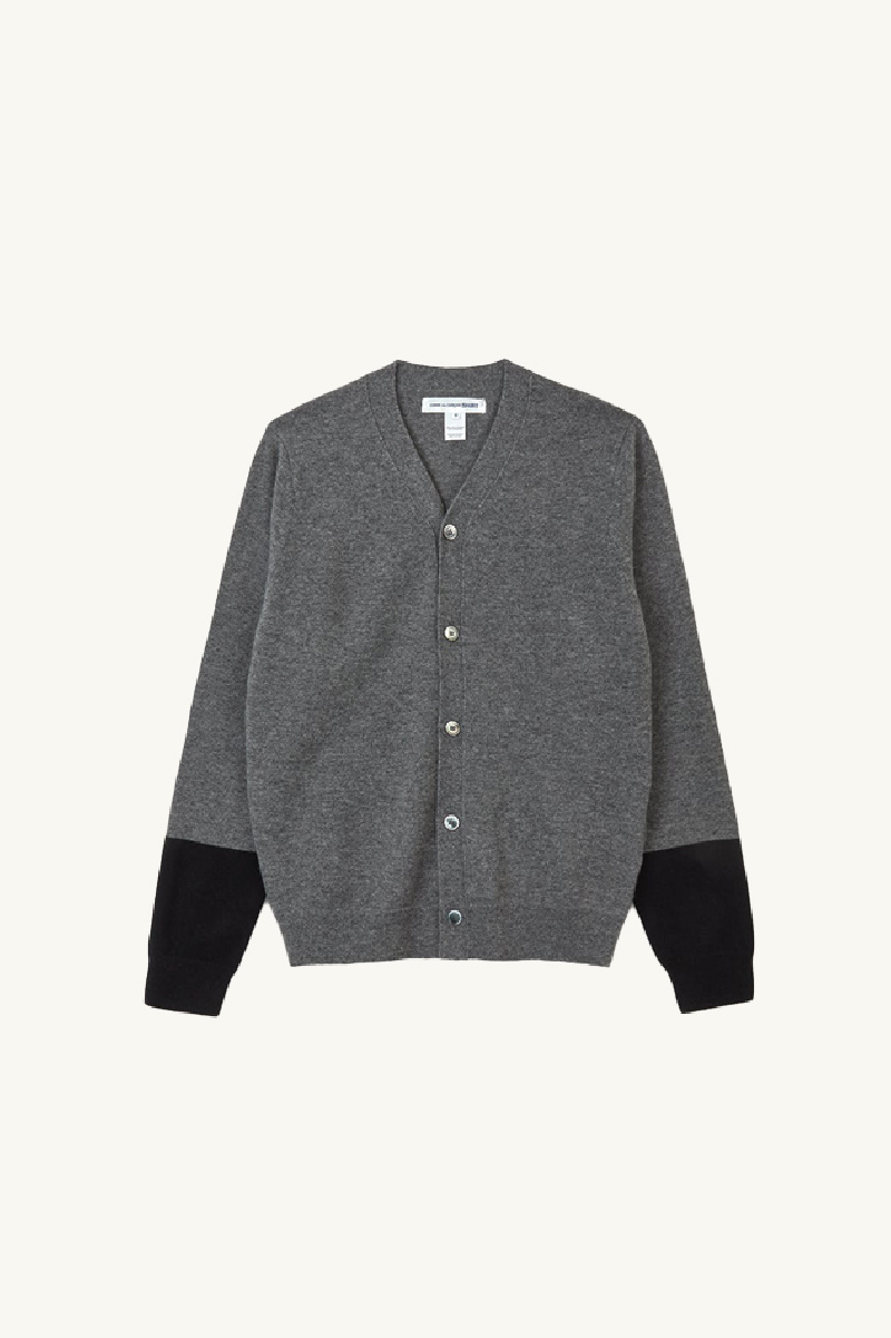 Cardigan en maille confectionné en laine grise et noire, de la marque Comme des Garçons.