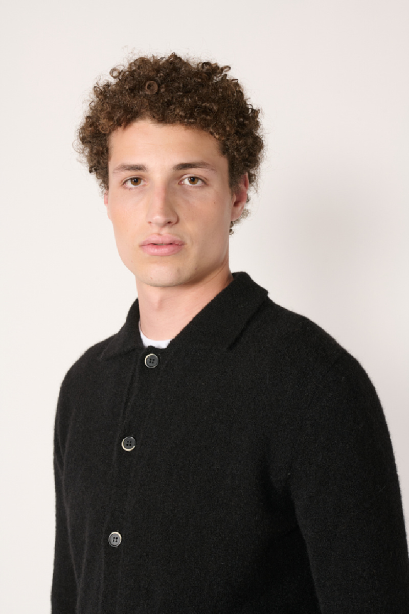 Il offre une coupe ajustée à col, une ouverture boutonnée sur l’avant et des finitions côtelées.
