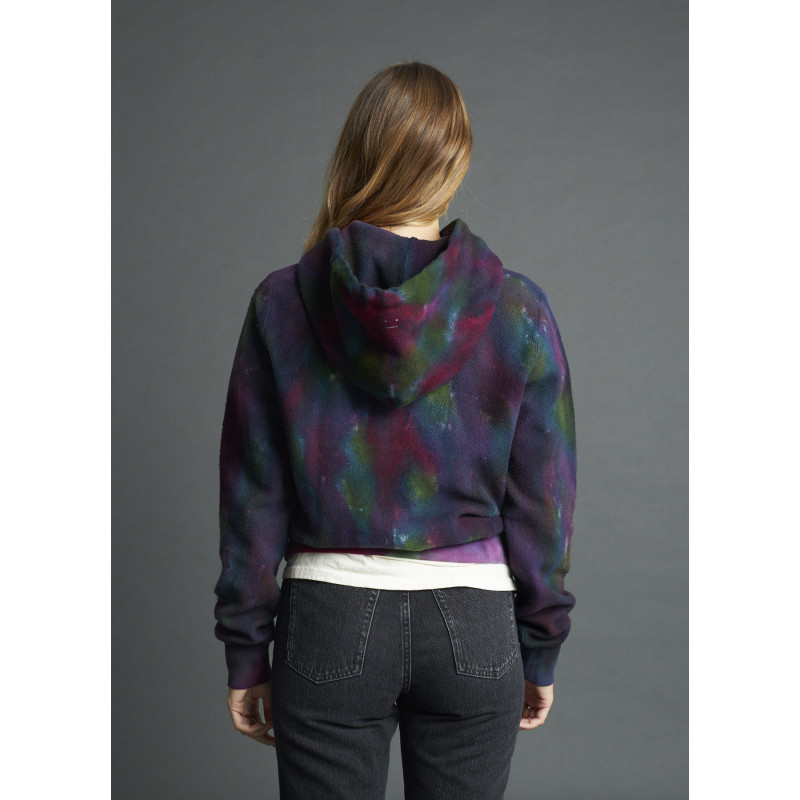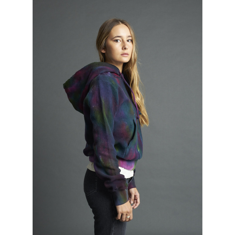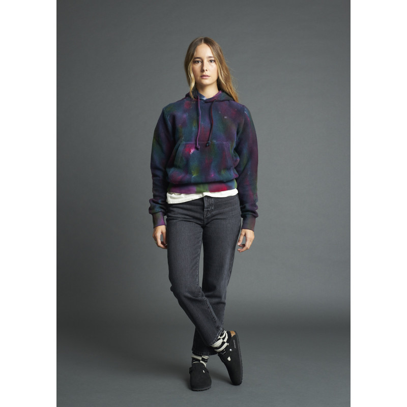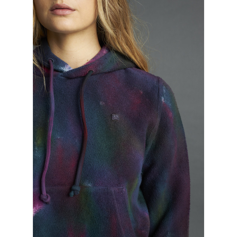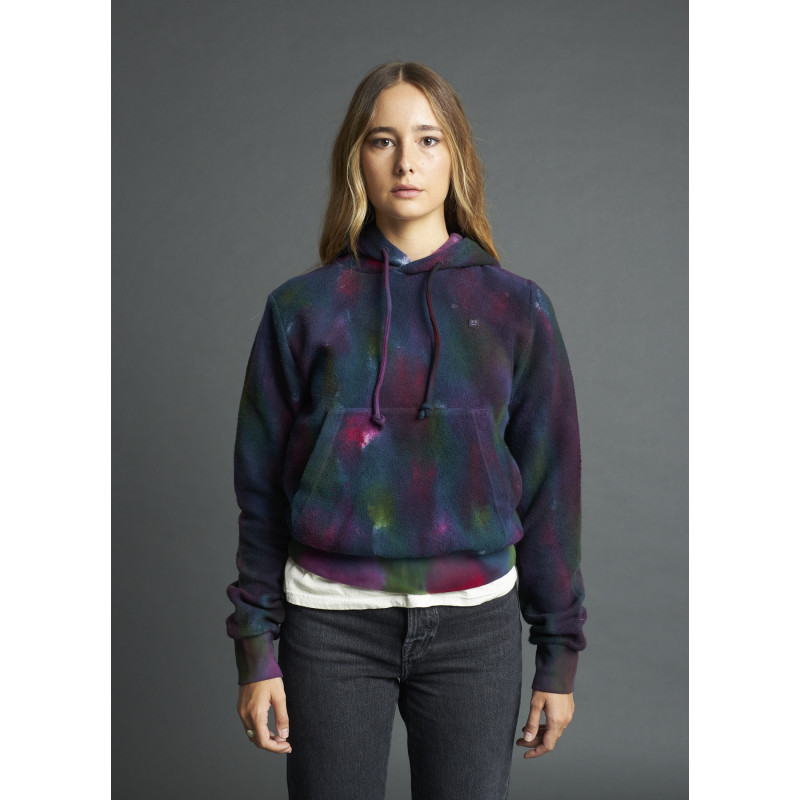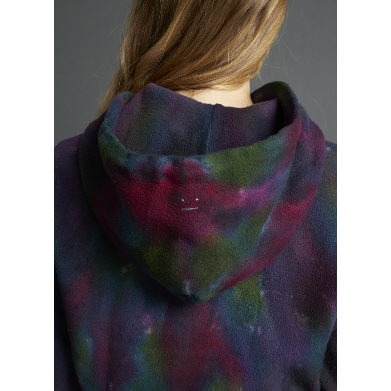 Hoodie à capuche Acne Studios noir imprimé tie-dye dans les tons rose, vert, violet, logo face sur la poitrine, manches longues, cordons de serrage de la capuche, coupe droite, ourlet droit, poche centrale, bord-côte aux poignets et à l'ourlet.