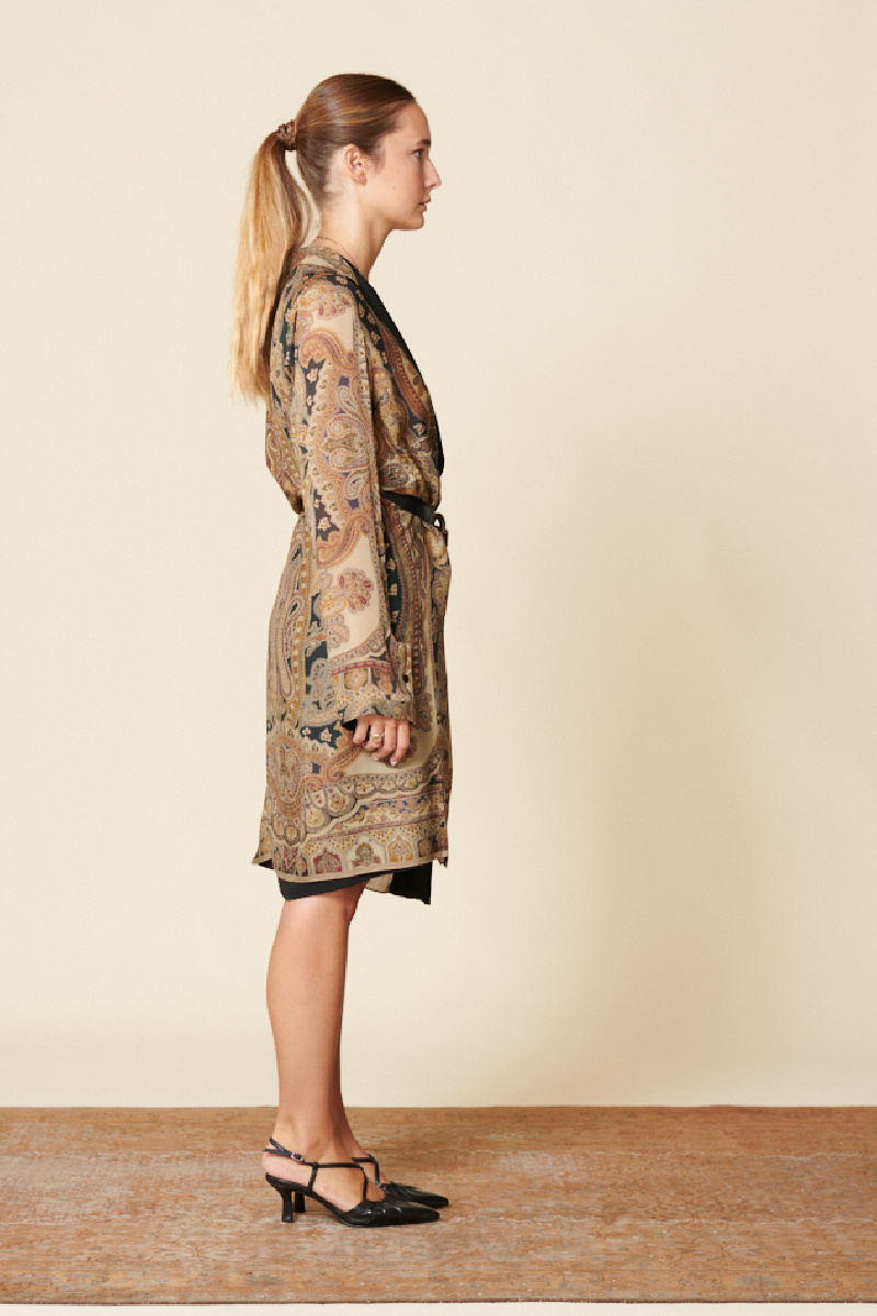 La robe foulard en soie de la marque Ibrigu, de style robe foulard, avec ses manches longues, et son vol v noir, elle est confectionnée en soie avec un imprimé motif multicolore cachemire.Fermeture cache-coeur, permettant de la porter ouverte ou fermée selon vos envies. Cette veste kimono se distingue par sa coupe oversize, offrant confort et élégance.