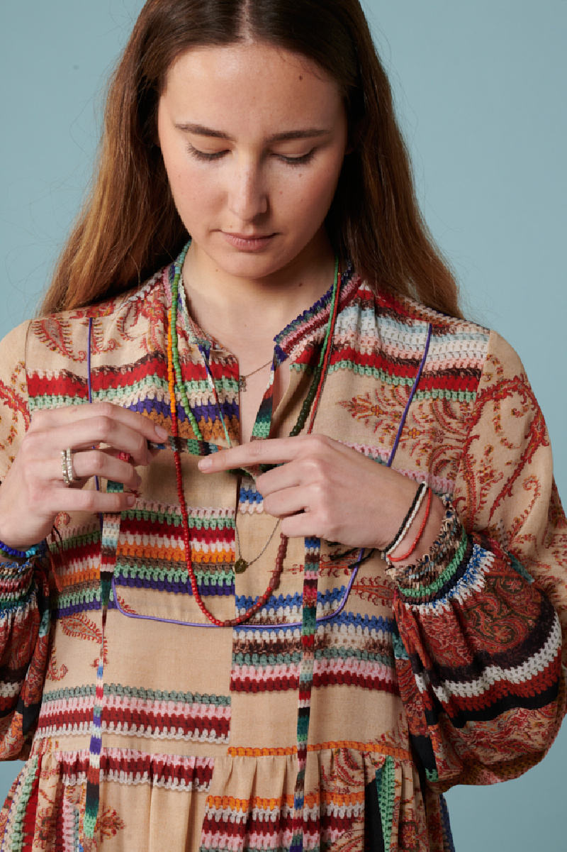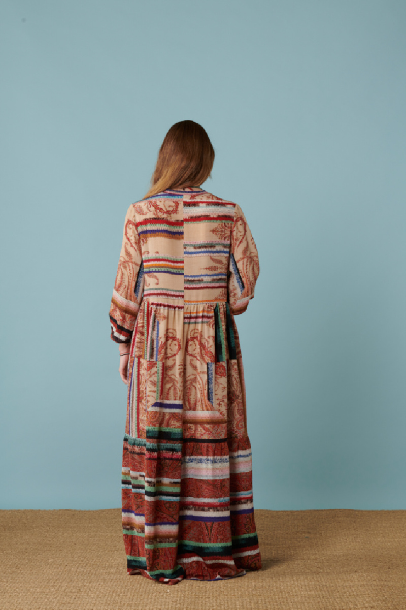 Robe longue de la marque Pierre-Louis Mascia, multicolore avec imprimés, manches longues, poches de chaque côté, col v, fermeture avec un ruban au niveau du col et léger élastique à ce niveau, serrage élastique au niveau des poignets, couture épaisse violette sur l'encolure en forme carrée.