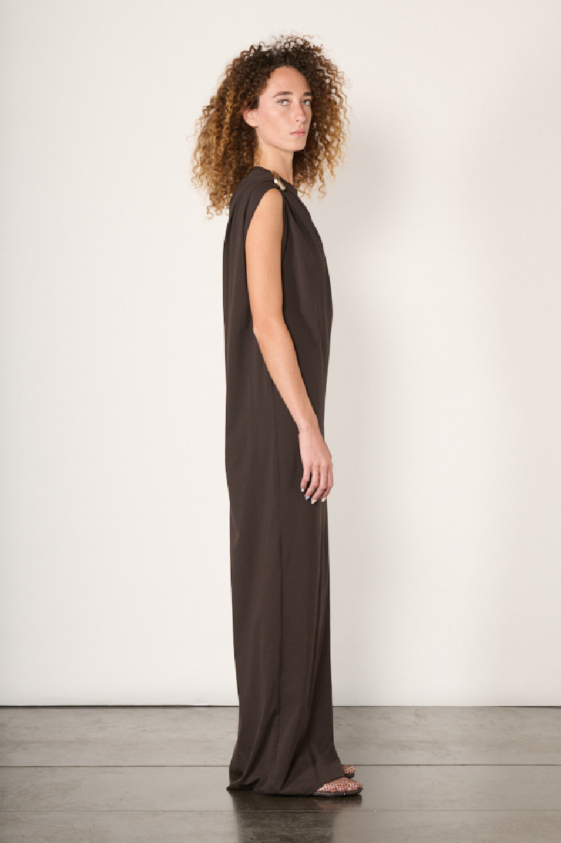 Elle offre une coupe droite, sans manche avec une épaule drapée asymétrique, maintenue par un anneau en métal brossé doré, orné d'une pierre naturelle marron.