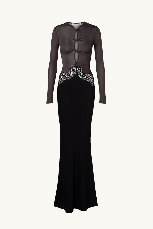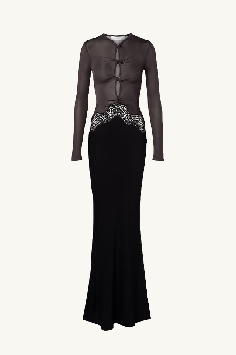 Robe longue confectionnée dans une maille côtelées extensible couleur Carbone, avec dentelle Verner, de la marque Christopher Esber.