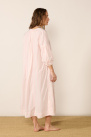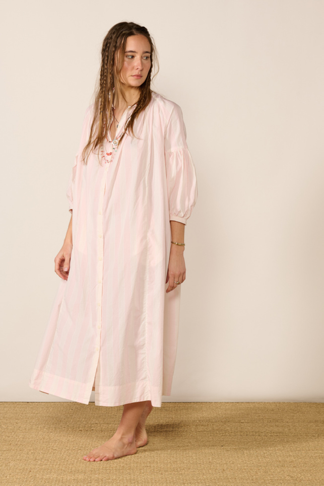 Son design à larges rayures roses et crème est sublimé par des détails froncés au niveau de l’encolure et des manches.