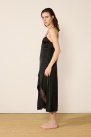 Elle offre une silhouette ajustée, longueur mi-mollet, ornée d’une fente à volants dévoilant une délicate dentelle.