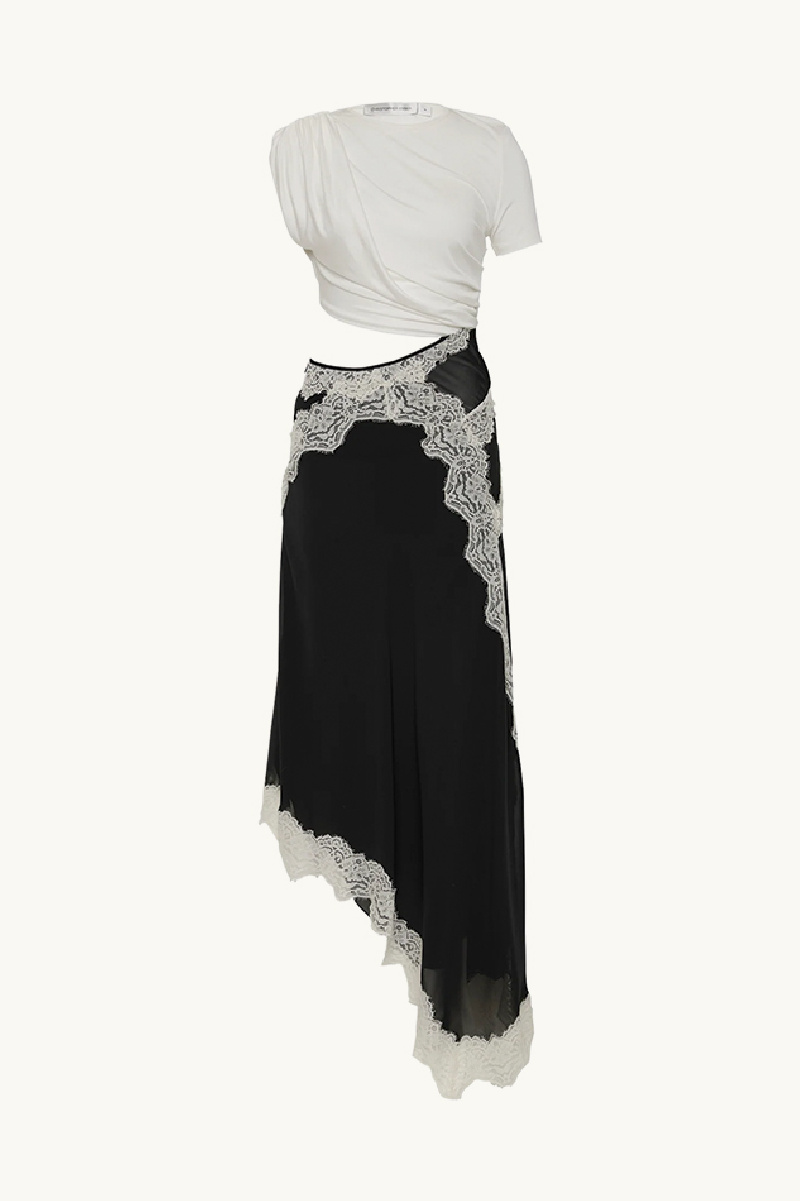 Dotée d’une coupe ajustée qui épouse parfaitement la silhouette, elle se compose d’un t-shirt blanc torsadé, subtilement relié à une jupe longue fluide en soie noire. Cette dernière est rehaussée de dentelle blanche contrastante et se distingue par un tombé asymétrique, en cascade.