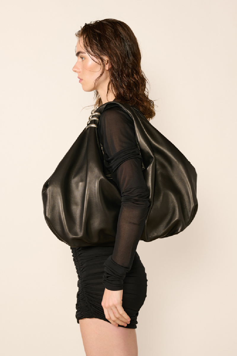 Il se distingue par un design arrondi et sculptural, qui se plie et se drape naturellement, créant une silhouette fluide et contemporaine. Les poignées sont sublimées par des anneaux métalliques en spirale, apportant un contraste subtil et structurant à son volume souple.
