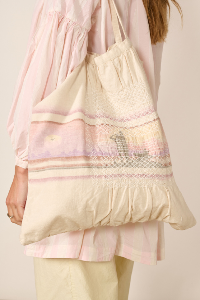 Il se distingue par un motif aux nuances rosées évoquant un coucher de soleil, accompagné de broderies géométriques et de fronces délicates.