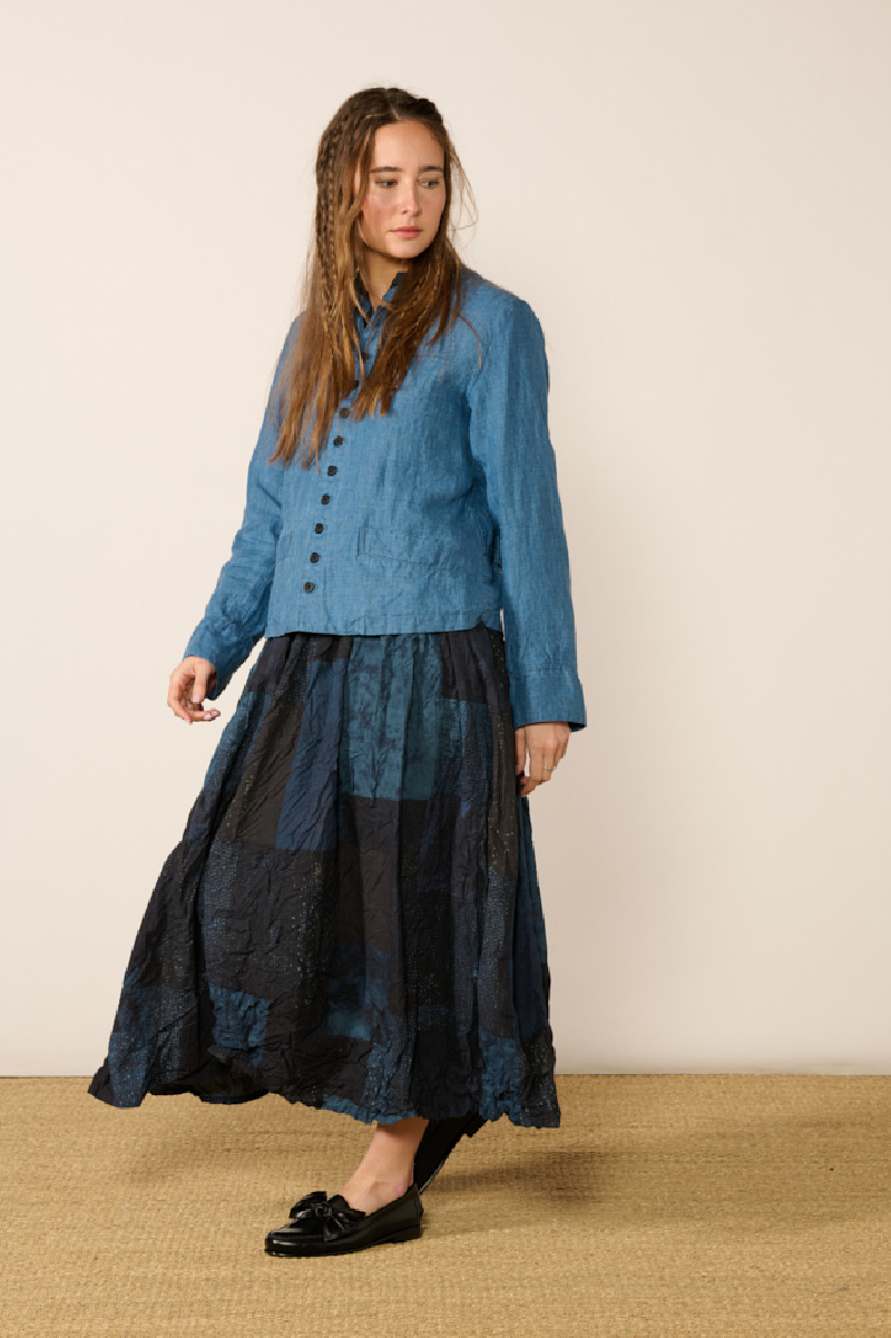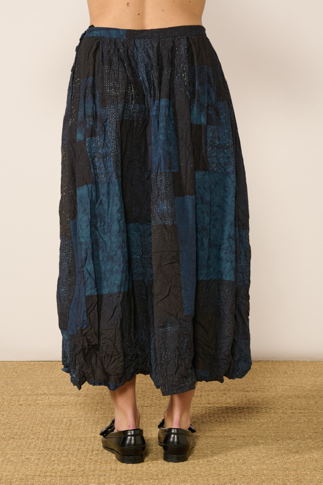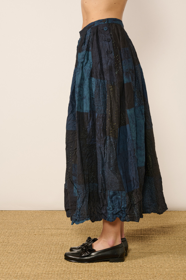 Réalisée en coton imprimé Tsugihagi, une technique japonaise traditionnelle de patchwork qui assemble différents motifs pour un rendu unique. Le tissu, imprimé à Kyoto, est assoupli et légèrement froissé, offrant un toucher doux et naturel.