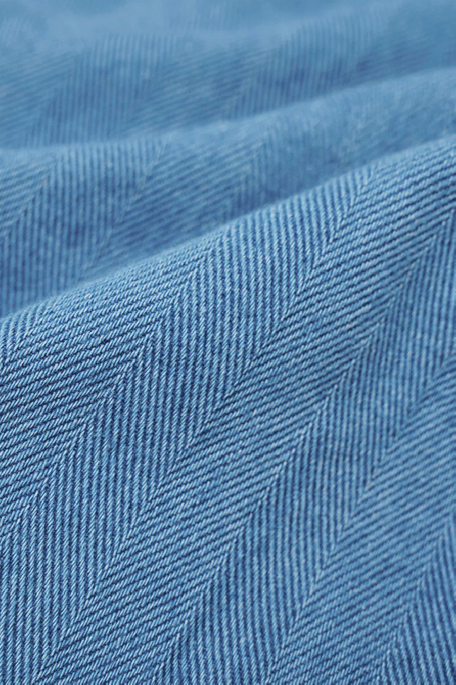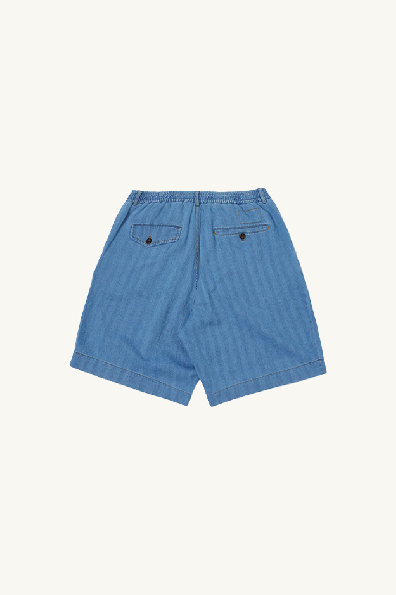 Short confectionné en coton indigo délavé à chevrons, de la marque Universal Works.
