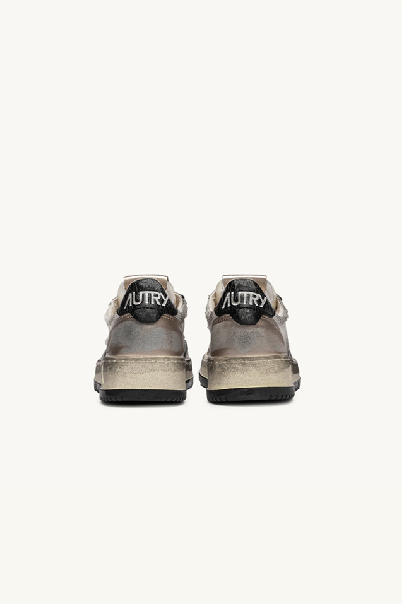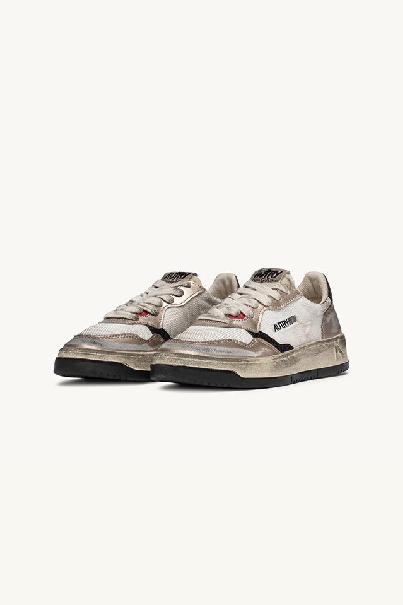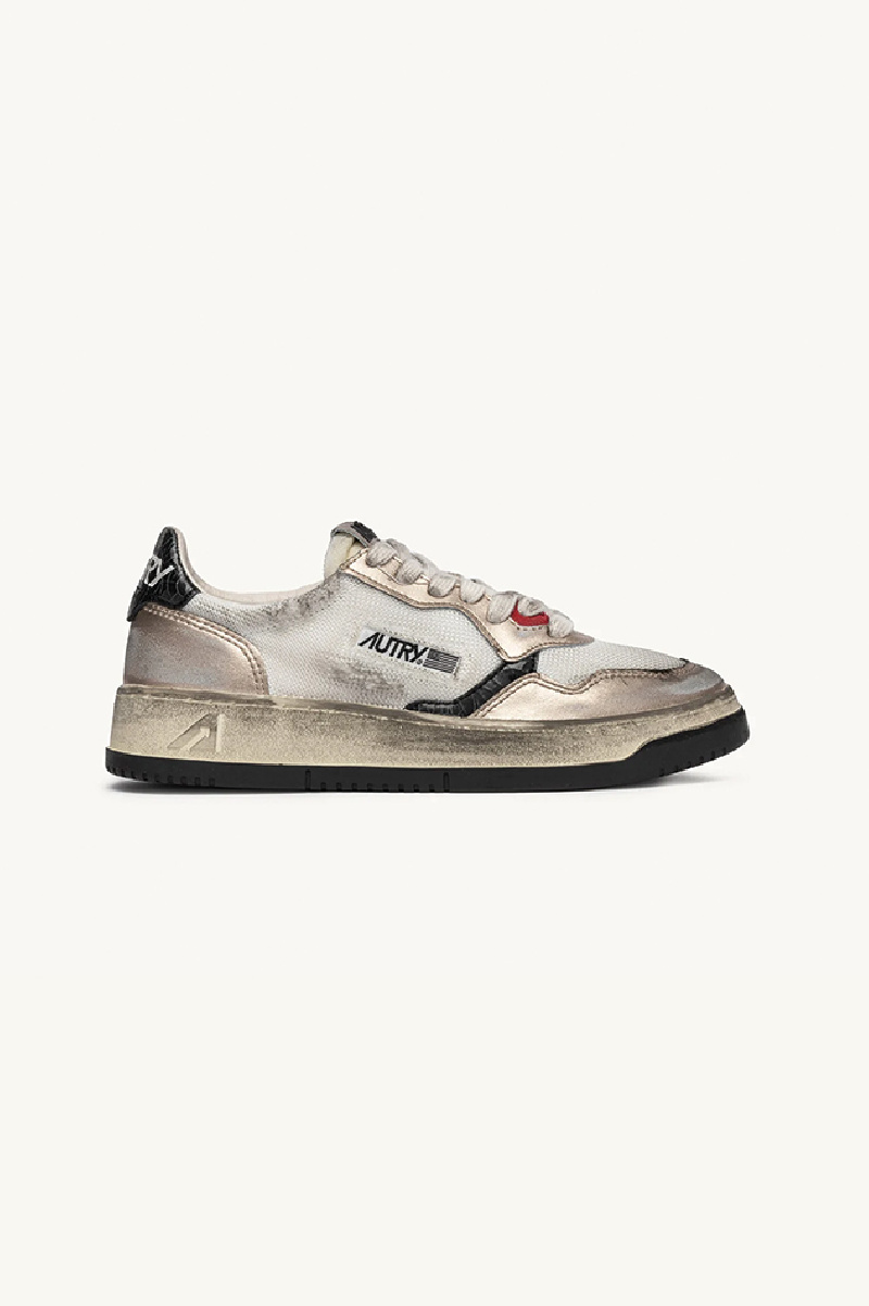 Baskets Autry, modèle Super Vintage Low, en cuir souple doré et filet blanc, à effet vieilli.