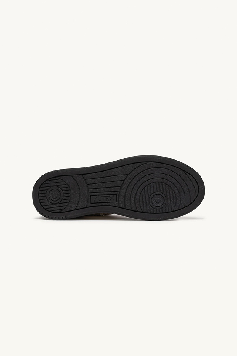 Sa tige est confectionnée en micro-filet blanc, avec du daim couleur or - à traitement artisanal usé, et des détails en cuir craquelé noirs.