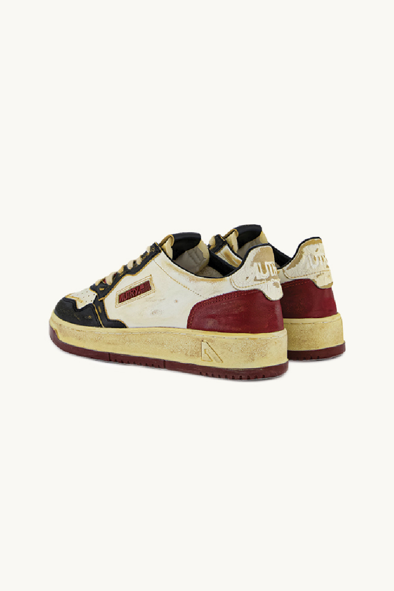 Baskets Autry, Homme, en cuir, noir et syrah, effet vieilli, avant-pied perforé, semelle en caoutchouc, fermeture à lacets, languette en tissu avec étiquette super vintage, contrefort rembourré, liserait rouge sur la semelle extérieure.