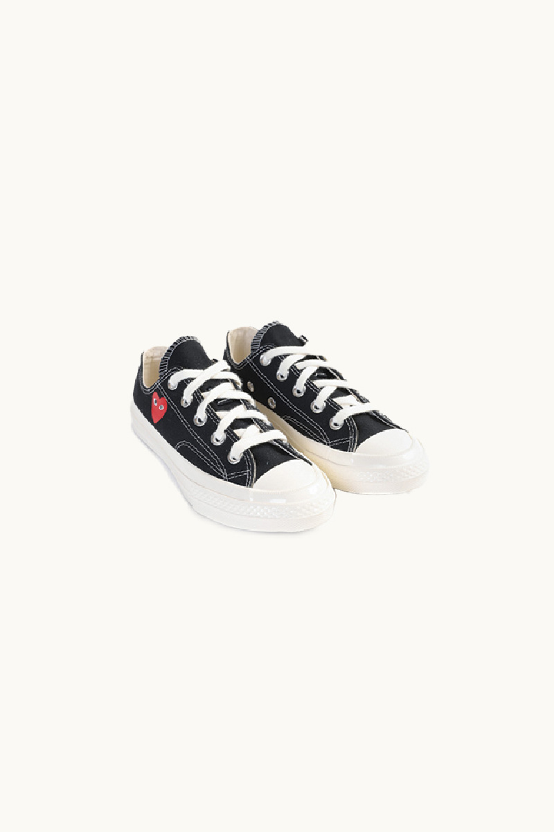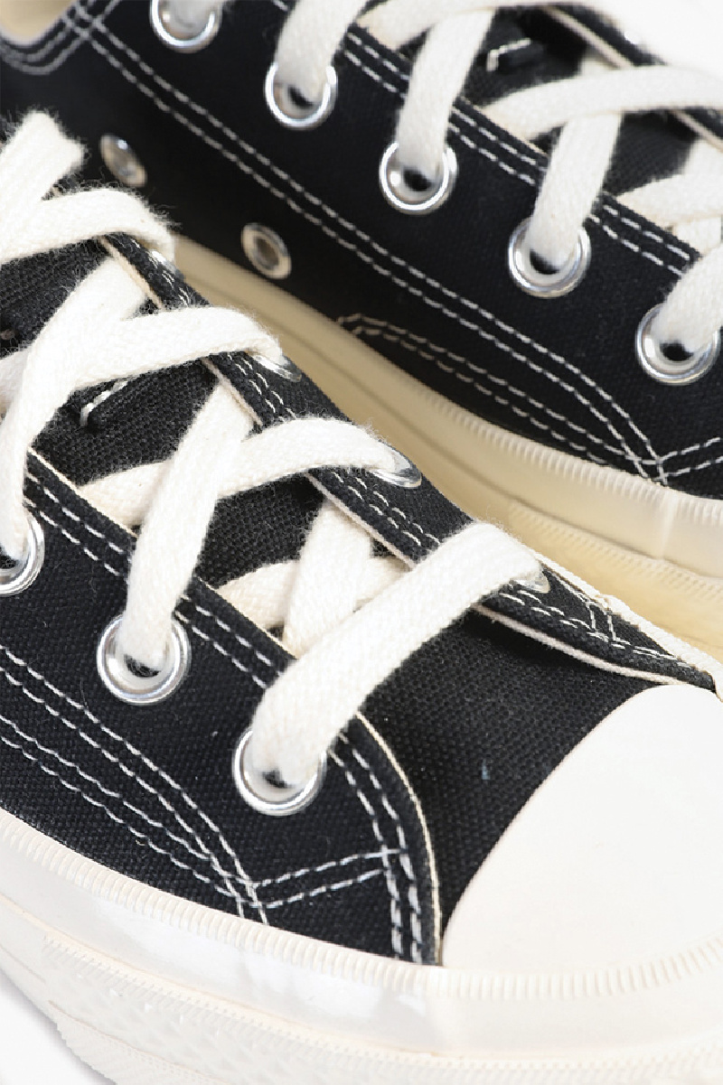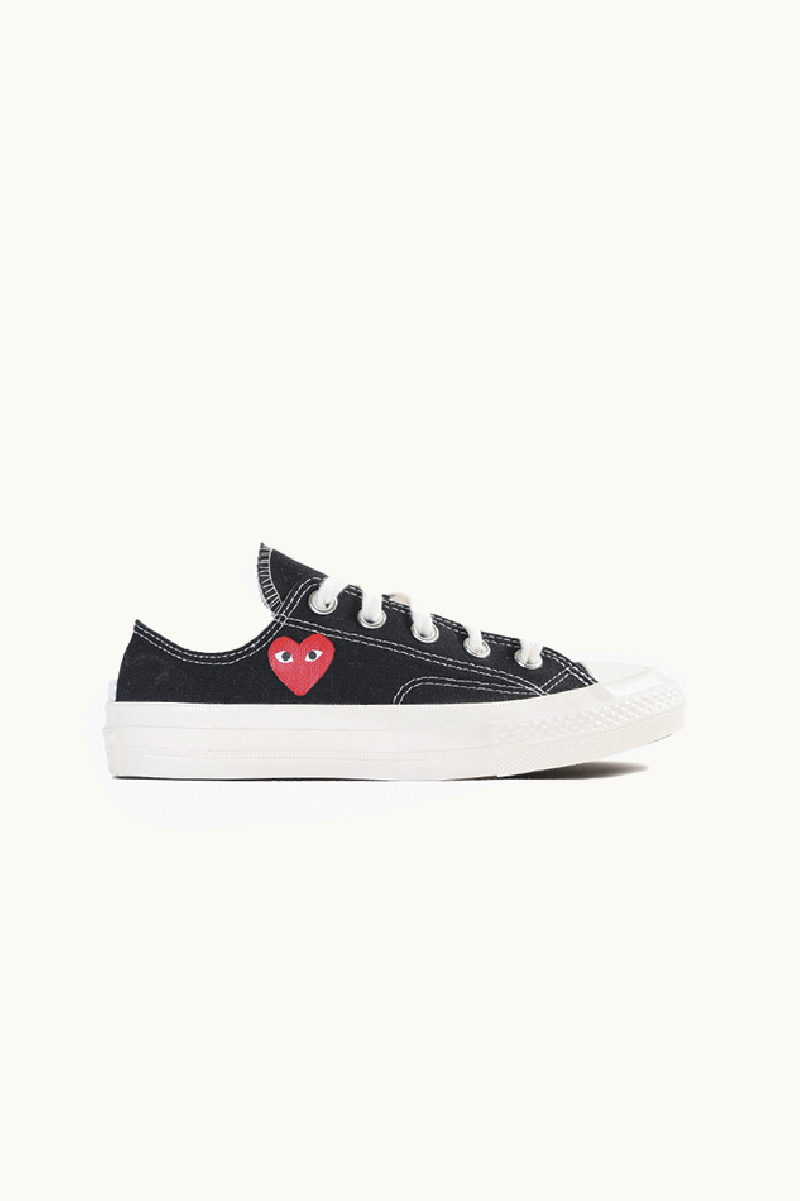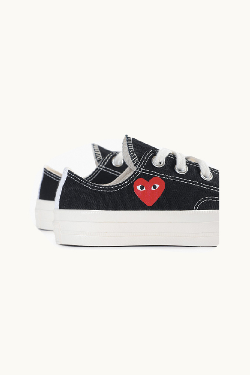 Converse Chuck Taylor x CDG noires, arborent un motif coeur patch logo rouge sur le côté, un bout rond, une fermeture à lacets, une hauteur en dessous de la cheville, une semelle en caoutchouc, et un liseré blanc sur l'arrière.