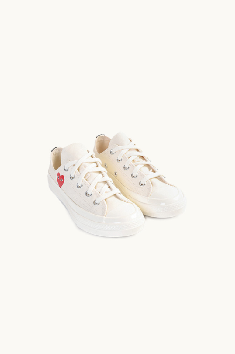Converse Chuck Taylor x CDG blanches, arborent un motif coeur patch logo rouge sur le côté, un bout rond, une fermeture à lacets, une hauteur en dessous de la cheville, une semelle en caoutchouc, et un liseré blanc sur l'arrière.