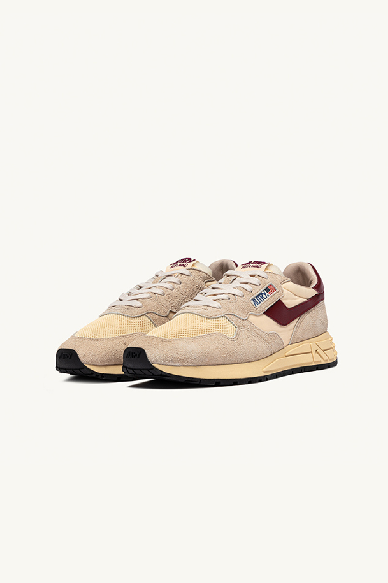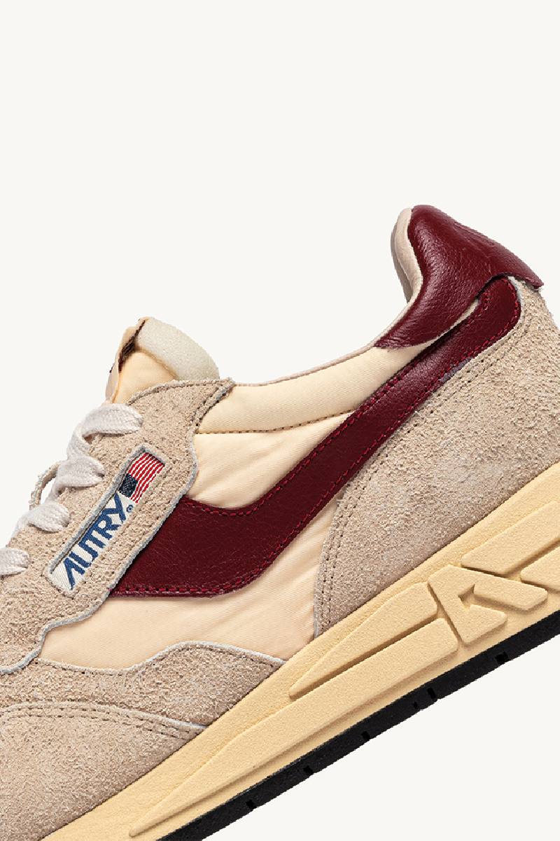 Baskets Reelwind Low de la marque Autry, écru, en daim élégant et nylon durable, détails en cuir de couleur Ruby Wine.