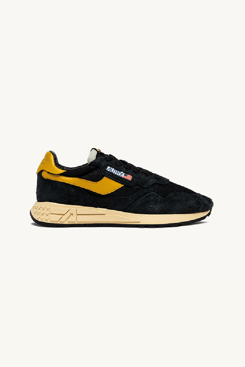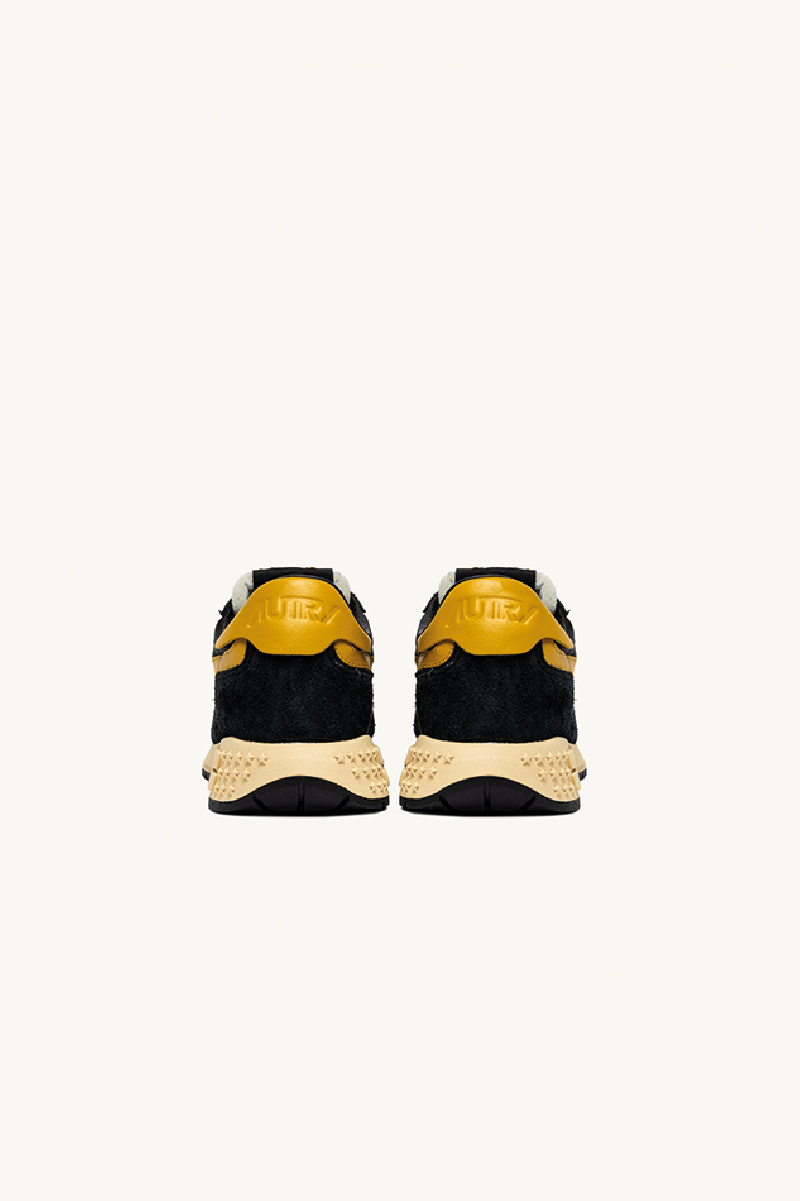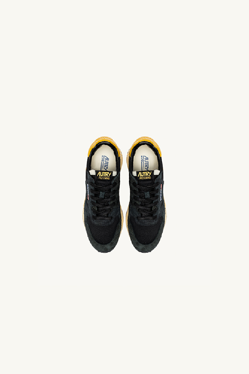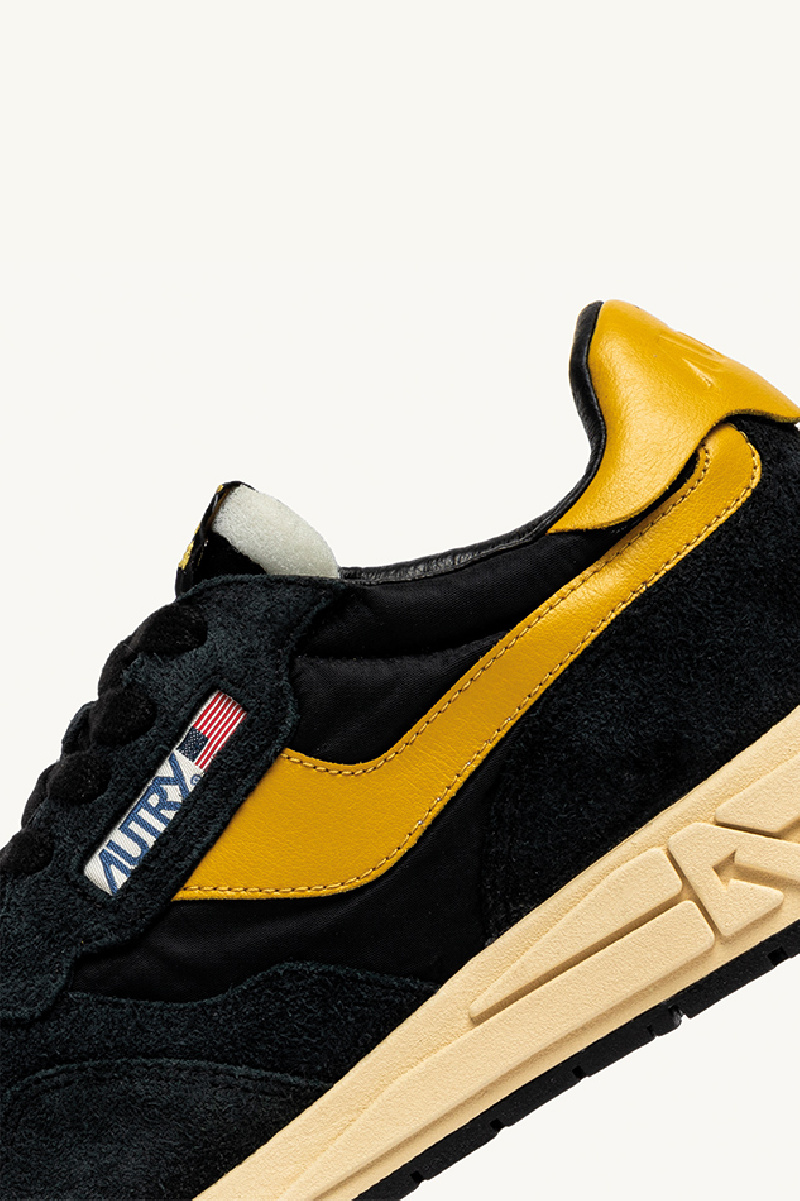 Baskets Reelwind Low de la marque Autry, en daim nylon noir et cuir jaune.