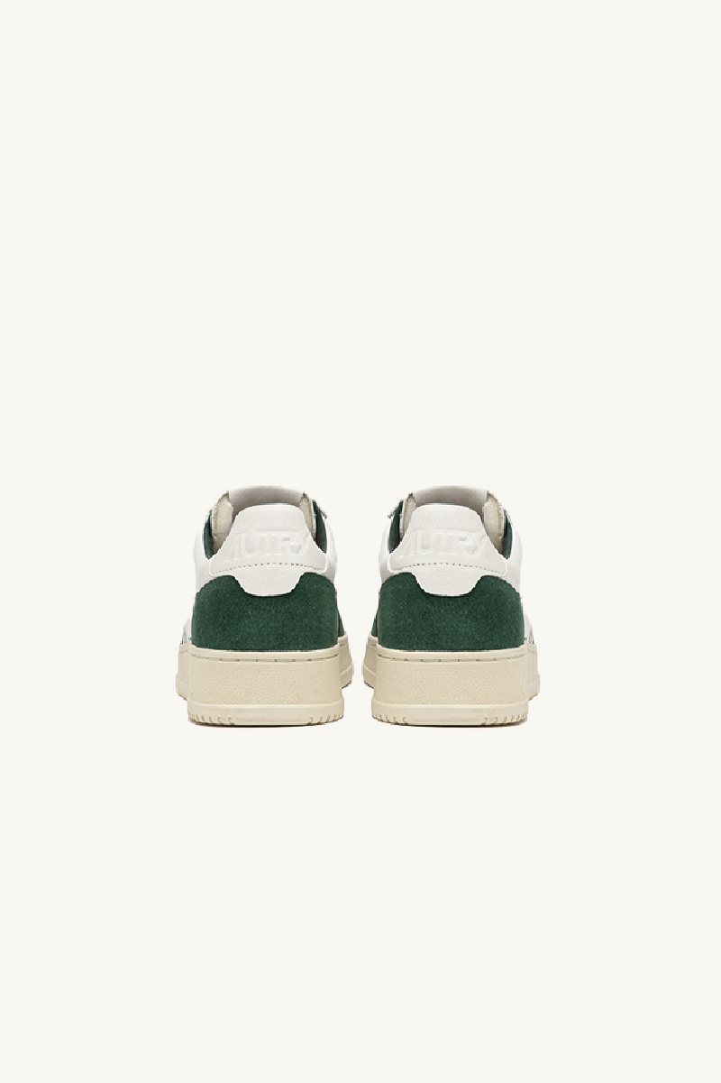 Paire de baskets AUTRY, modèle Medalist low, en cuir blanc et daim vert bouteille.