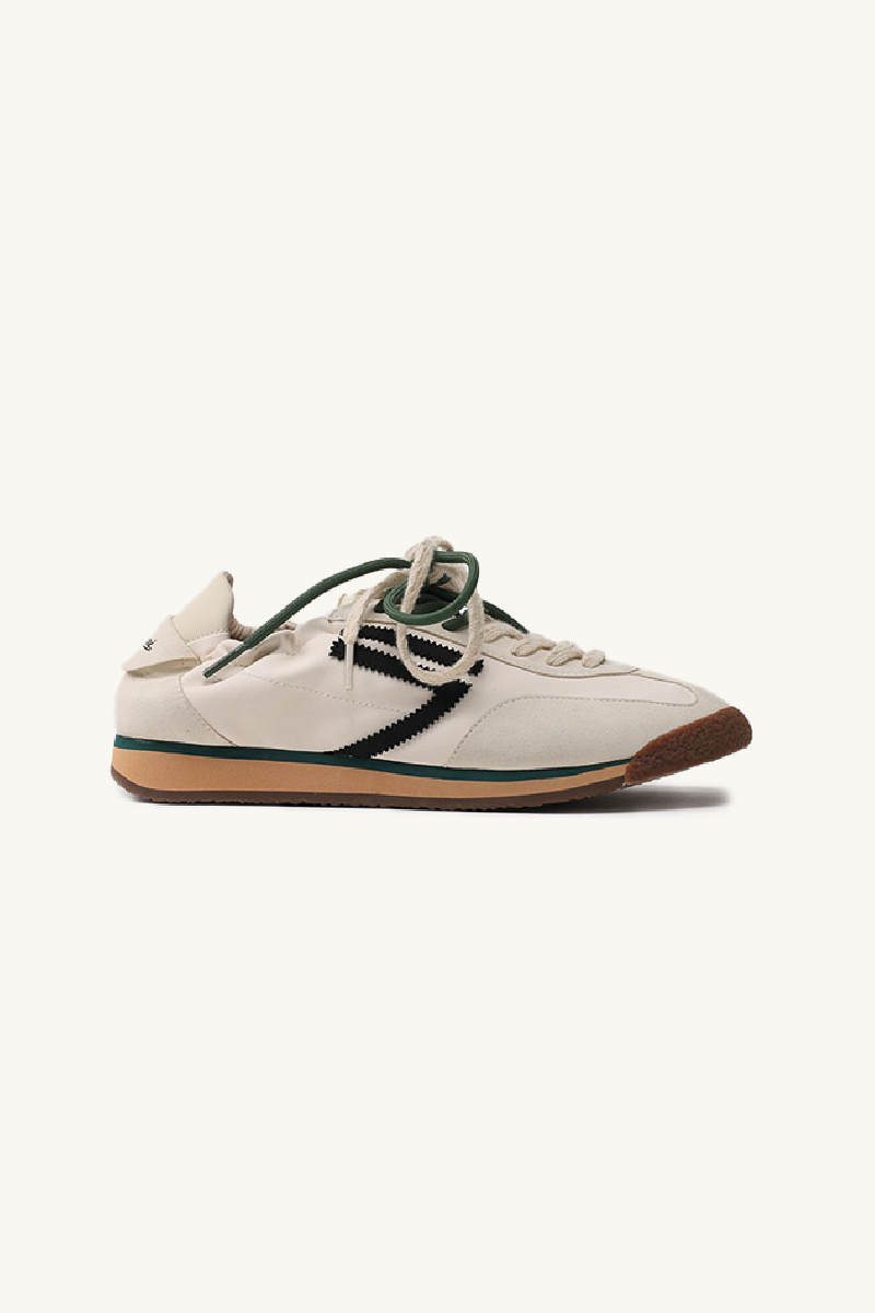 Design inspiré des 80's, avec une tige fine et souple, resserrée au niveau de la cheville, des doubles lacets aux couleurs contrastantes, une semelle extérieure verte, camel et marron.