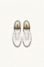 Le modèle est complété par un laçage en coton, une languette ornée d’une étiquette et d'un contrefort en cuir blanc souligné du logo emblématique de la marque.